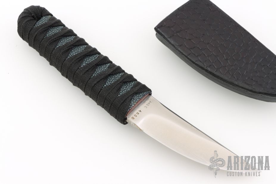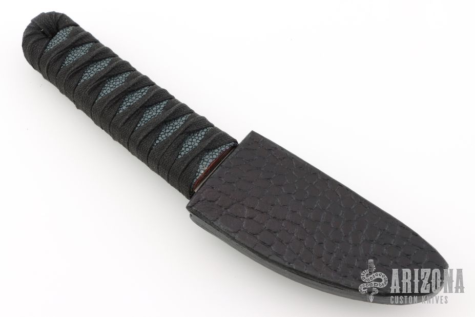 This Tanto by Mickey Yurco features a satin finished blade with .183" blade thickness and 1.140" blade depth. The handle has black cord wrap over grayrayskin and copper menuki. Comes with black leather belt sheath. New from maker at the 2025 Blade Show West! #4850