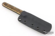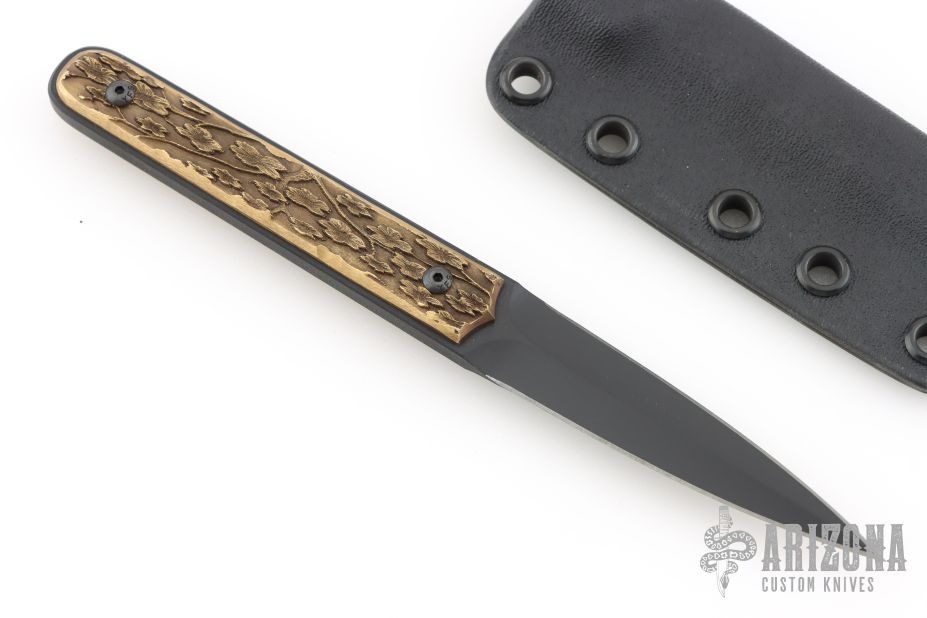 This Dagger by Greg Moffatt features a black cerakote finished blade with .187" blade stock and .693" blade depth, full tang construction. The handle has laser engraved brass scales. Comes with a kydex sheath. New from maker at the 2025 Blade Show West!