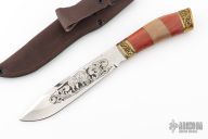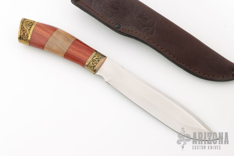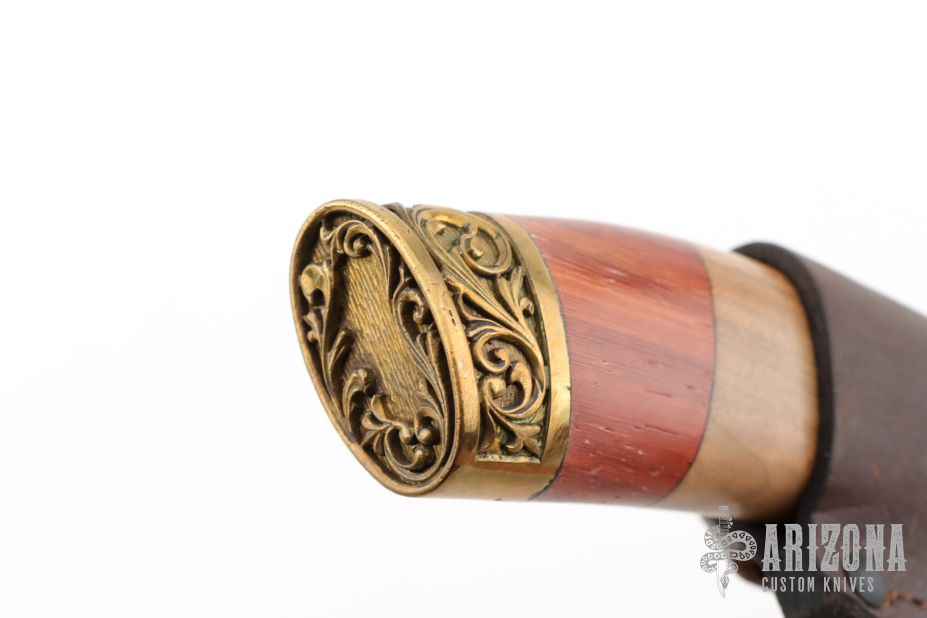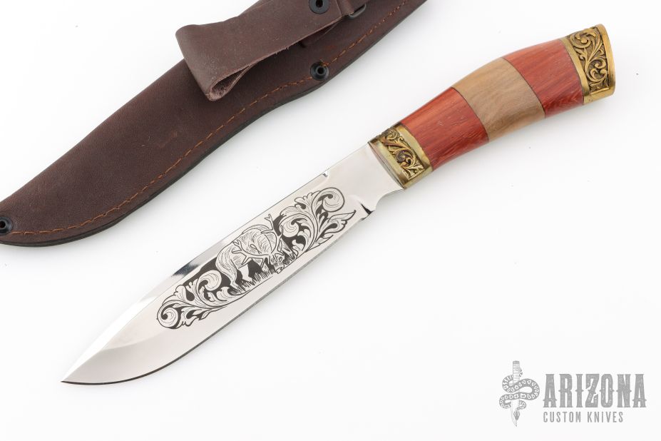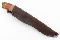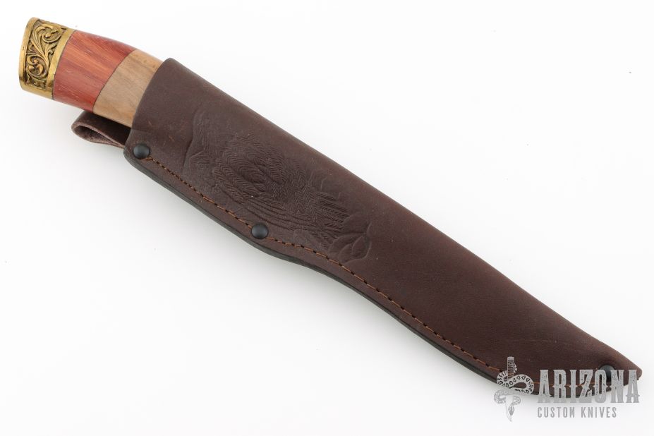 This knife by Pavlovo Knives features a mirror polished blade with false top edge, .149" blade stock and 1.437" blade depth, hidden tang construction. Has an etching of an elk and some scrolls. The handle has a case brass guard and butt, three-piece wood grip. Comes with a brown leather sheath and a COA. Has some light scratches, otherwise excellent condition.
