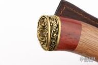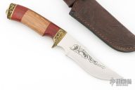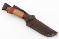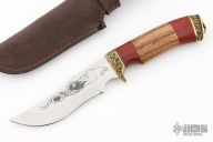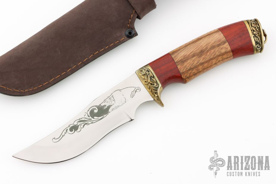 This knife by Pavlovo Knives features a mirror polished blade with .099" blade stock and 1.432" blade depth, hidden tang construction. The blade has an etching of a bear and some scrolls. The handle has a cast brass guard and butt with lanyard bail, three-piece wood grip. Comes with a brown leather sheath and a COA. Has some light scratches, otherwise excellent condition.