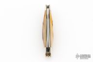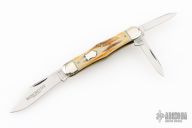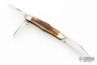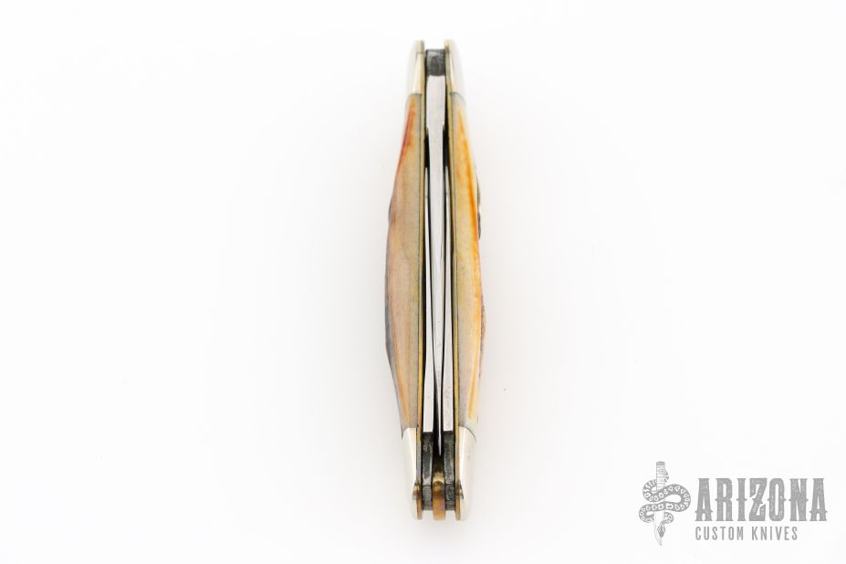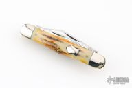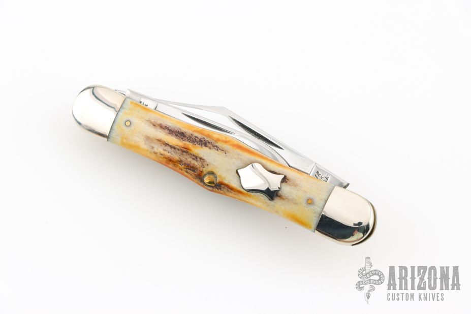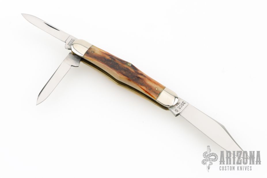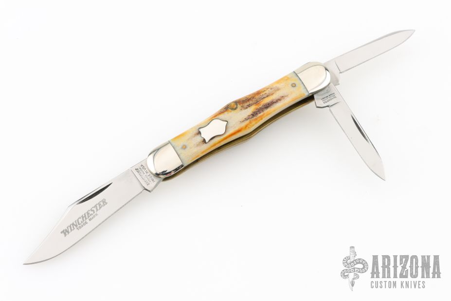 This Winchester 3-Blade splitback whittler features three mirror polished blades with nail nicks. Nickel Silver front and rear bolsters with stag covers. Brass liners and steel springs. Original box. Excellent condition.
