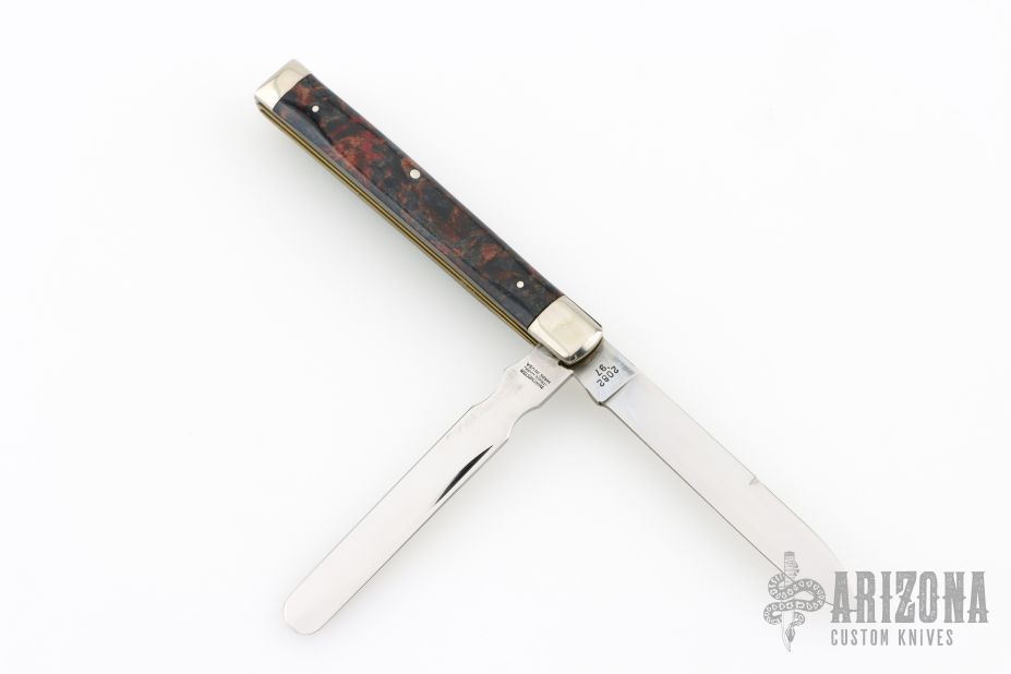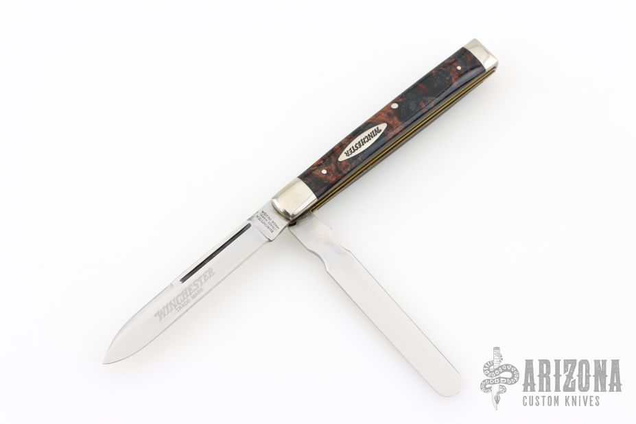 This doctors knife by Winchester features mirror polished blades with nail nicks, nickel silver bolsters and acrylic covers with a nickel silver shield, brass liners and stainless steel springs. Excellent Condition.  Comes with Winchester box.