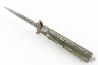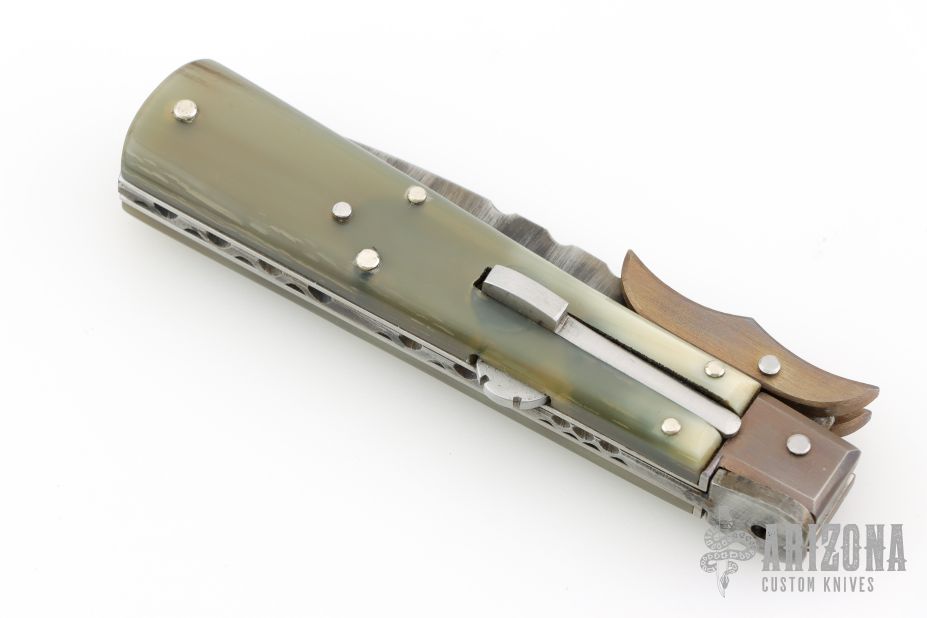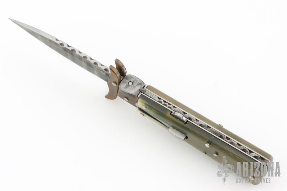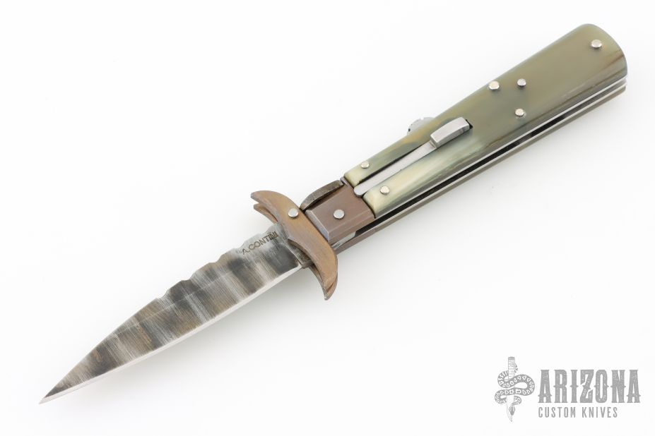 This Picklock Auto by Antonio Contini features a tiger stripe finished blade with fileworked spine. The handle has heat colored steel guards and bolsters, fileworked steel backspacer and liners, honey horn scales. Has a safety on the spine. Nice action and blade seating. Has a little blade play. Comes with original box. Excellent condition.