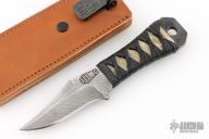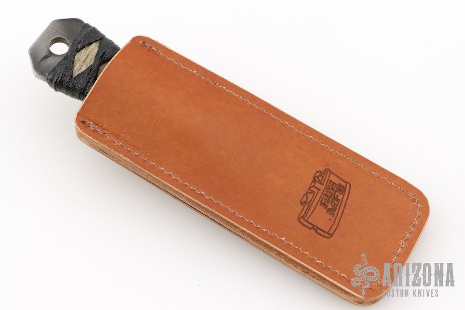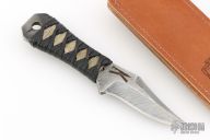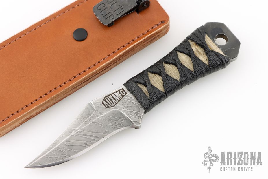 This Pocket Bowie by Auxiliary Manufacturing and Kopis Designs features an acid etched finished blade with a false top edge, .193" blade stock and 1.11" blade depth. The handle has a cord wrapped handle over underwrap. Comes with a leather sheath with clip and COA. New from maker at the 2025 Blade Show West!