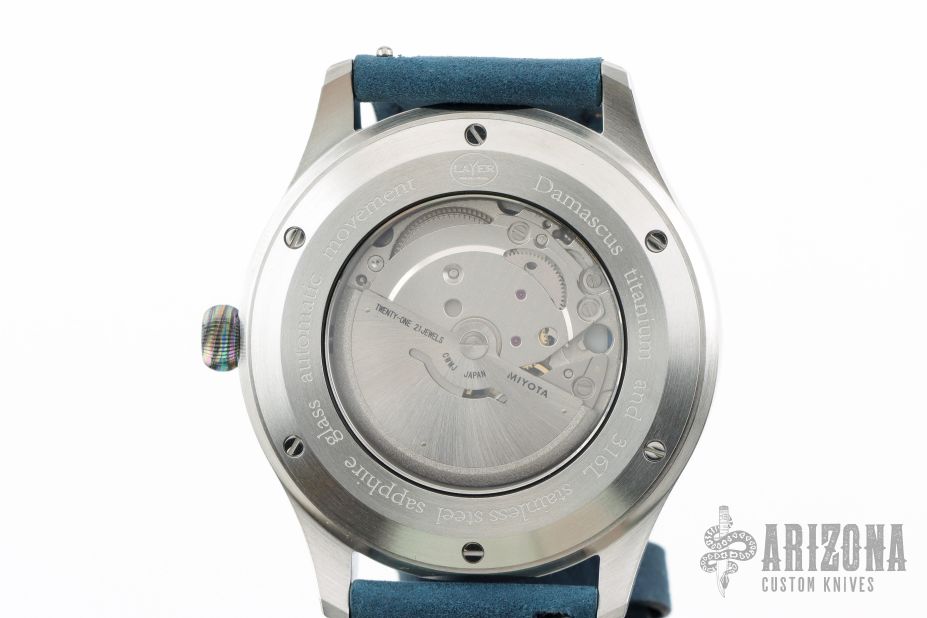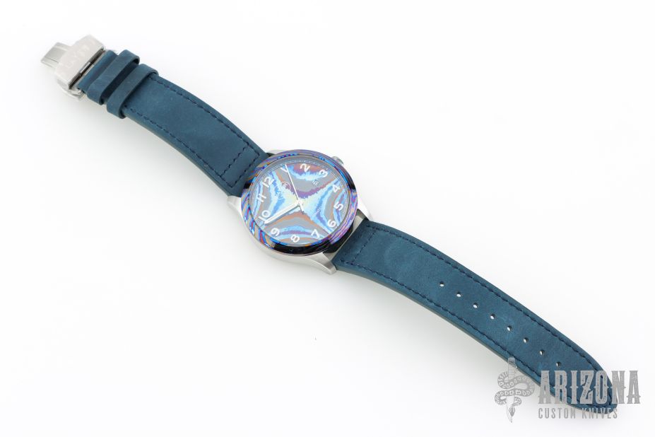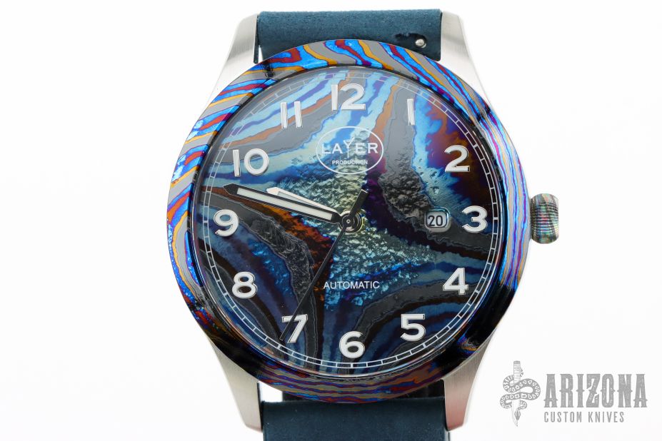This Production Watch by Layer Watches has a 316L Stainless steel case, Titanium Damascus bezel and Dial, sapphire glass front and back, Japanese automatic Miyota 8215 movement. This one is one of a kind. 43mm case and 13mm thickness. Genuine leather strap. Comes with a Velcro case and COA. New from maker at the 2025 Blade Show West!