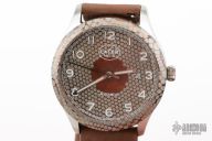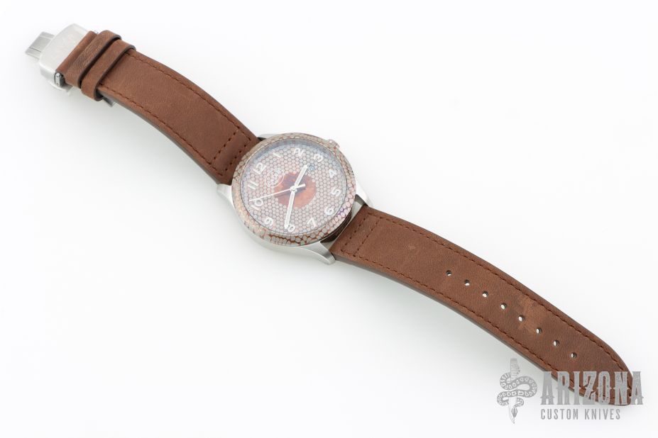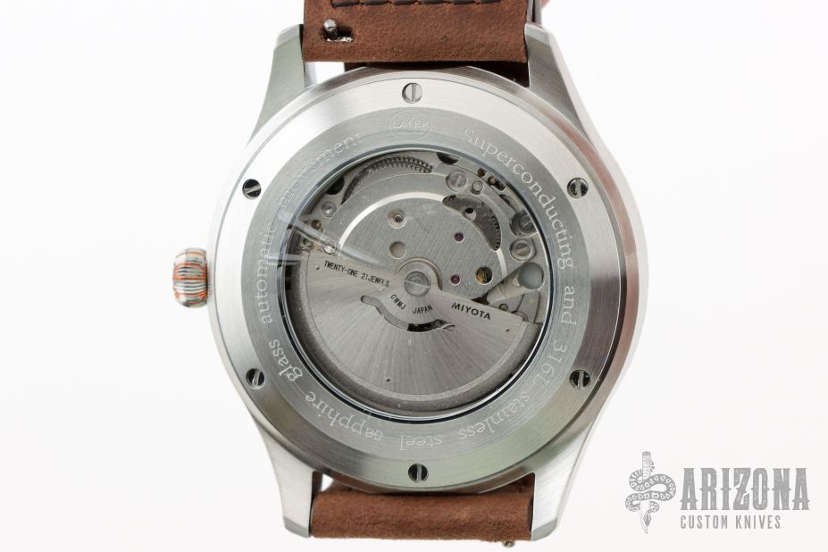 This Production Watch by Layer Watches has a 316L Stainless steel case, Super Conductor bezel and Dial, sapphire glass front and back, Japanese automatic Miyota 8215 movement. This one is one of a kind. 43mm case and 13mm thickness. Genuine leather strap. Comes with a Velcro case and COA. New from maker at the 2025 Blade Show West!