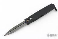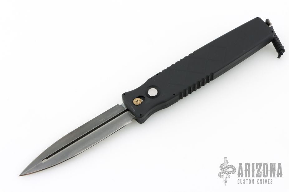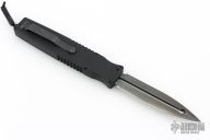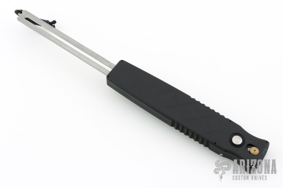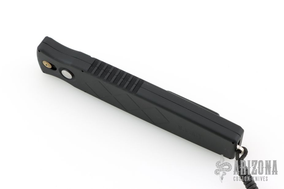 This Centurion OTF by S.W.A.T. is a push button single action automatic with single edge spearpoint blade with black finish. T6 black aluminum handle with hatched pattern milling. Blade is retracted by depressing button and pulling recharge handle in the butt. Slide safety. Has some light scuffs, otherwise excellent condition. One side of the blade is hand signed "SN. 100" and the other side says "SANTANGELO". Comes with original box.