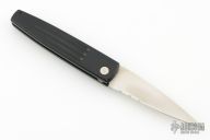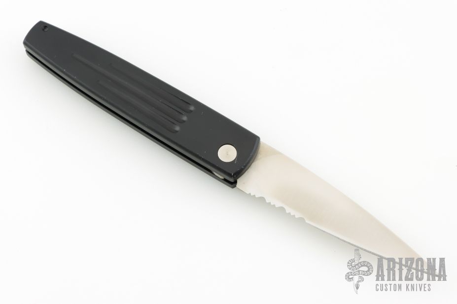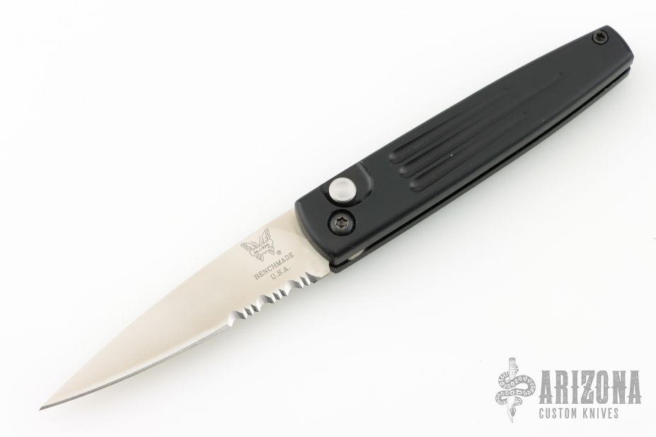 This Spike automatic by Benchmade Knives features a satin finished partially serrated blade and black anodized aluminum frame. Comes with original box and papers. Excellent condition.