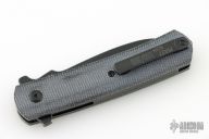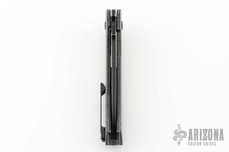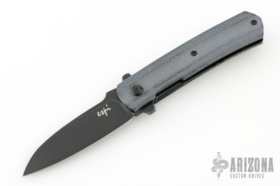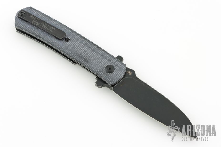 This linerlock flipper is a collaboration between Max Knives and Stephane Espi. It is a limited first run of 300 pieces. It features a black blade with flipper. The handle has black canvas micarta scales, stonewashed stainless steel liners and a black titanium backspacer with lanyard pin, tip up titanium clip. Clip reads "First Run 150/300. Comes with a Velcro case. New from maker at the 2025 Blade Show West.