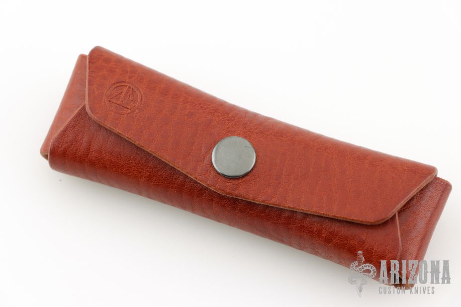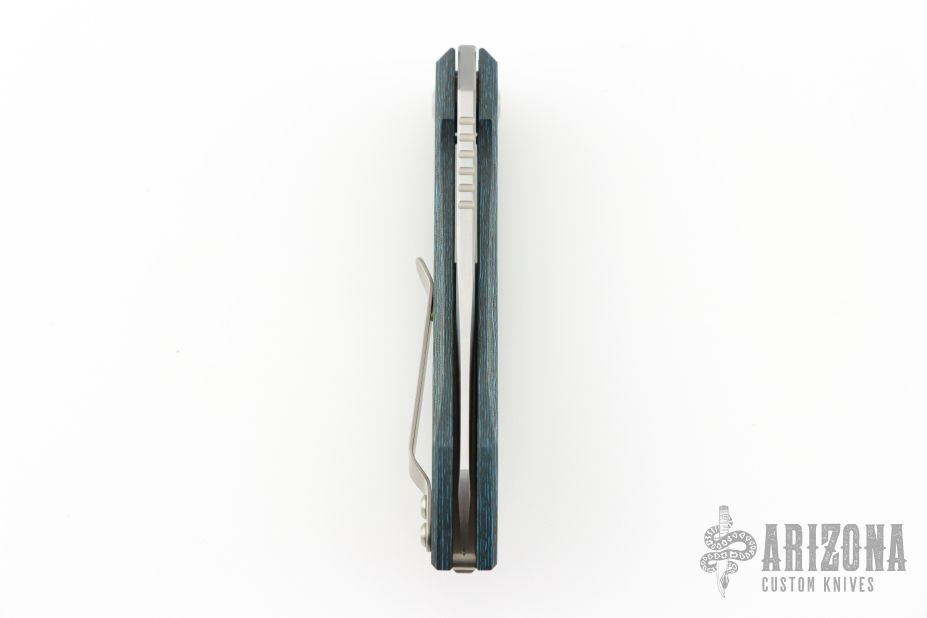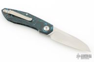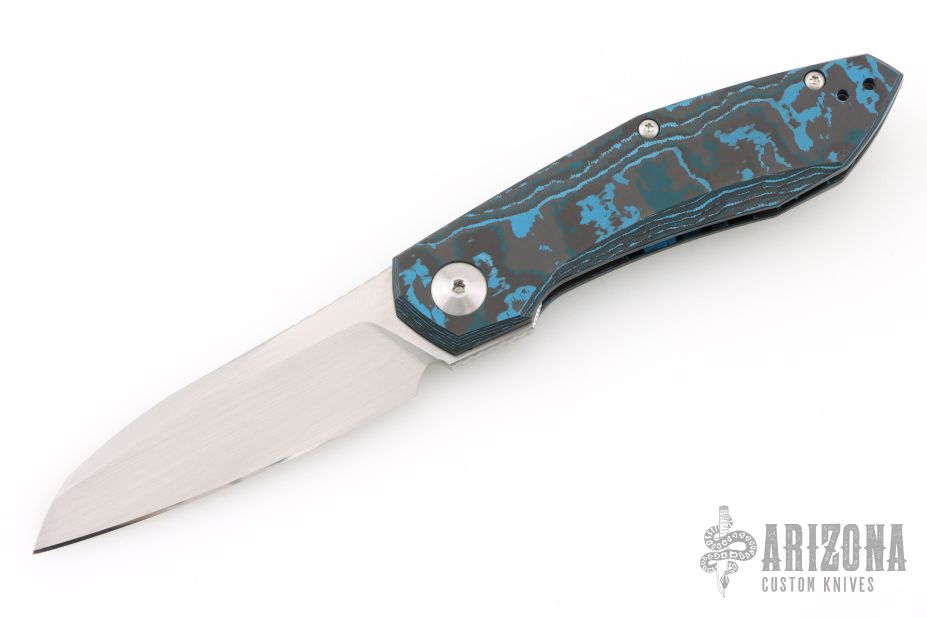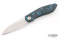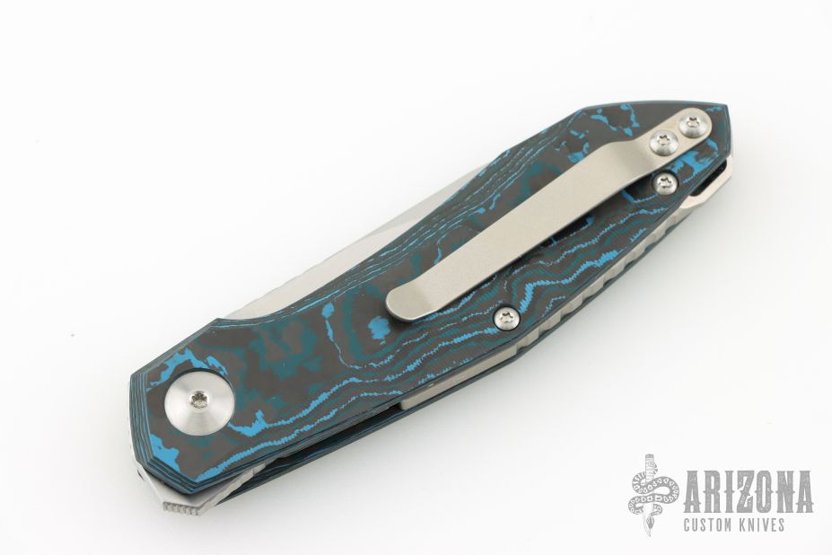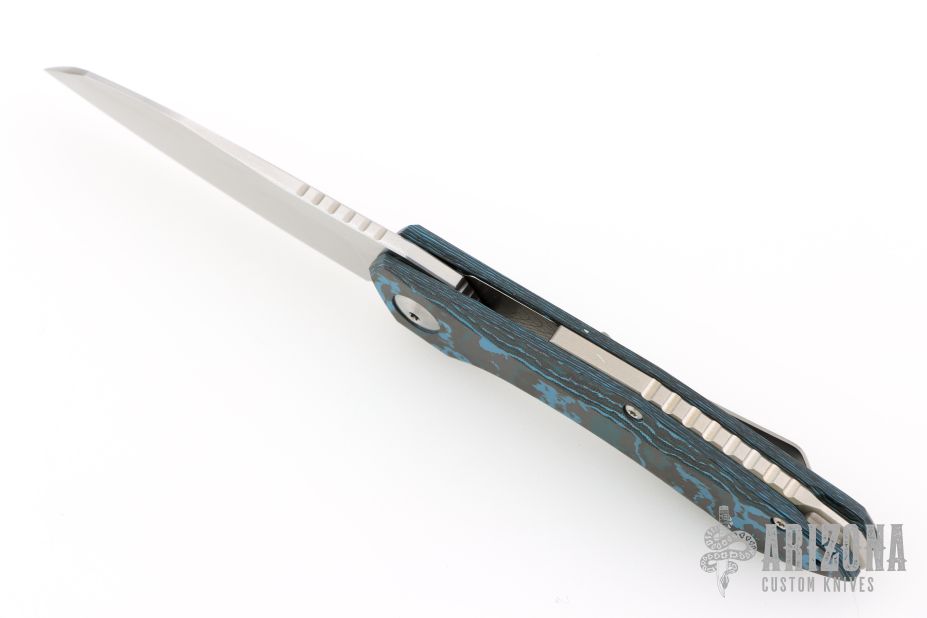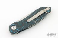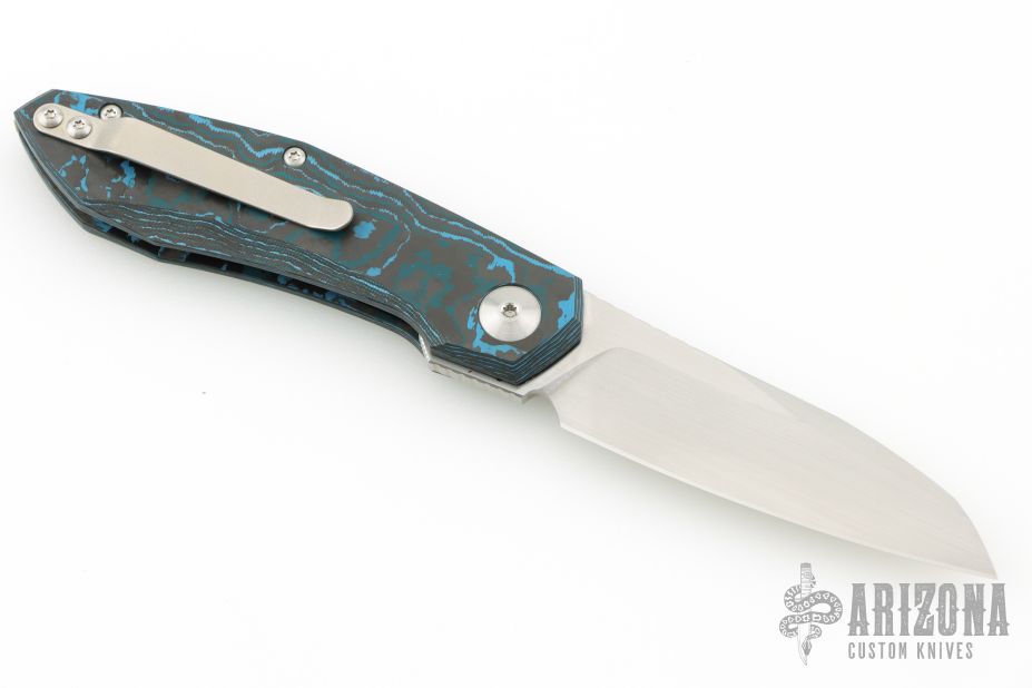 This FS Folder by Dmitry Sinkevich features a hand rub satin finished blade with notched thumbrest and flipper. The handle has a 3D milled blue/black carbon fiber scales, titanium backspacer and tip up clip. Has a lumed "7" on the backspacer. This knife is #7 of 10. This knife has a double detent style mechanism and does not lock. Has half-stop. Comes with original leather pouch. Excellent condition.