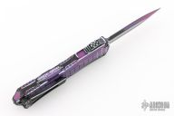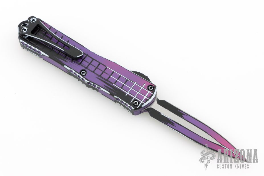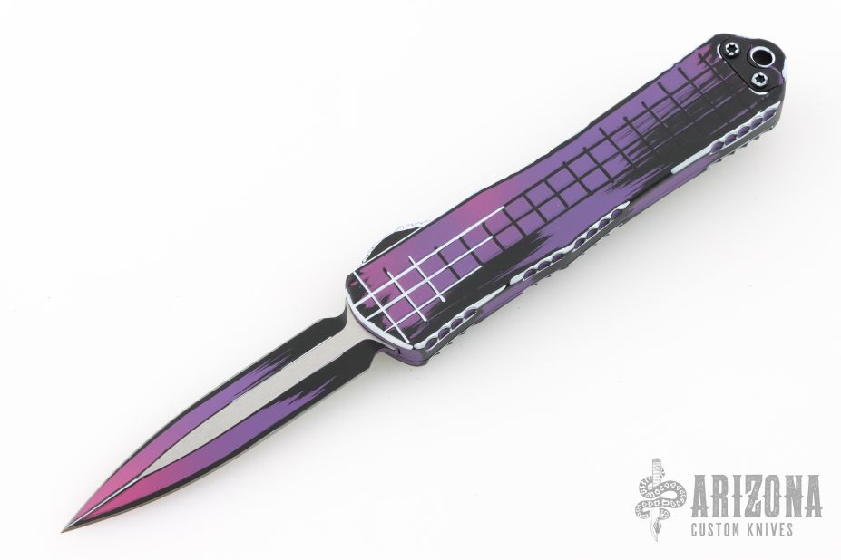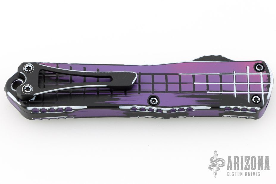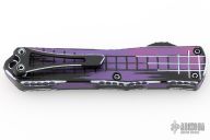 This Manticore-E by Heretic Knives features a double edge blade. The handle has an purple/white/black aluminum frame with matching black stainless steel tip down clip. S/N 074. Comes with original box, and lube. Excellent Condition.