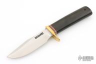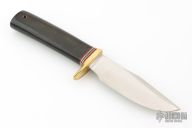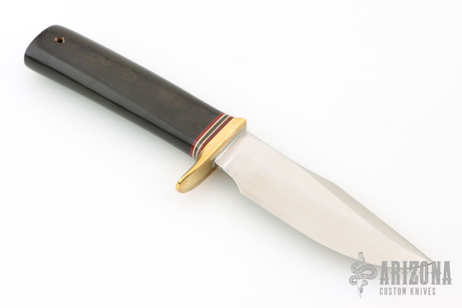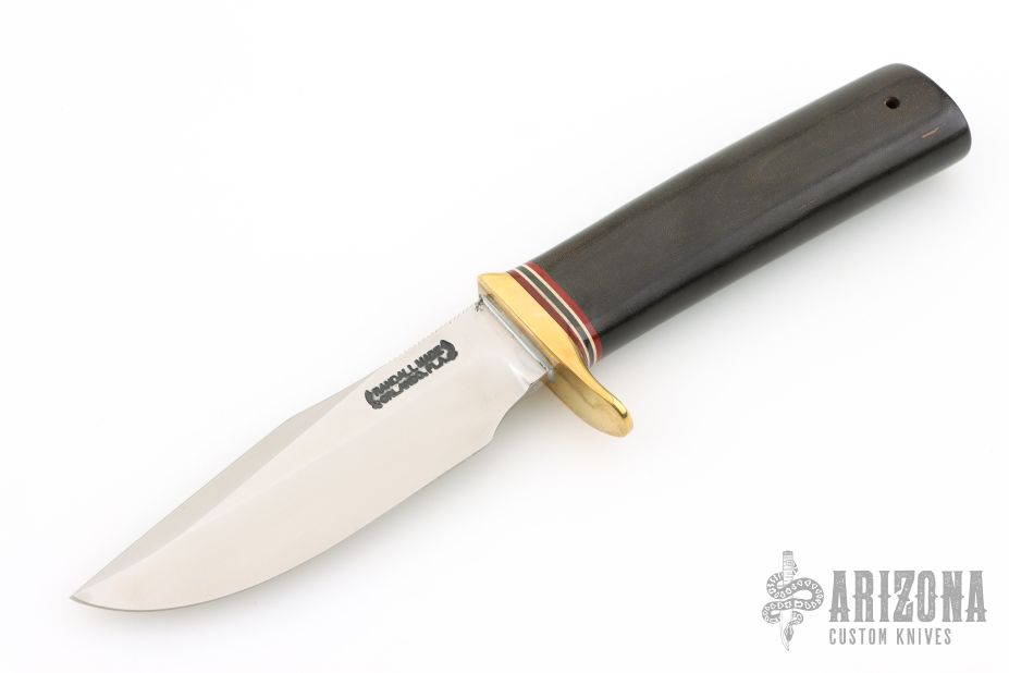 This Model 23 "Gamemaster" by Randall Made Knives features a satin finished clip point blade with sharpened top edge and a notched thumbrest, .202" blade stock and 1.245" blade depth hidden tang construction. The handle has a brass guard and a black linen micarta grip with red/white/blue spacers. Has a couple light scratches, otherwise excellent condition.