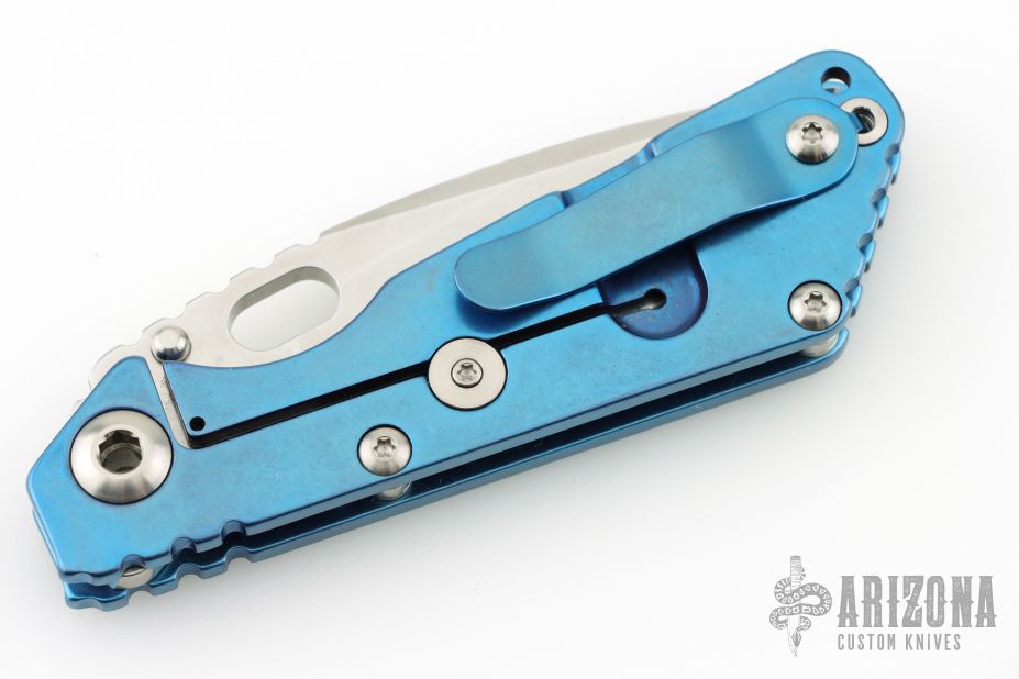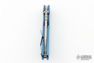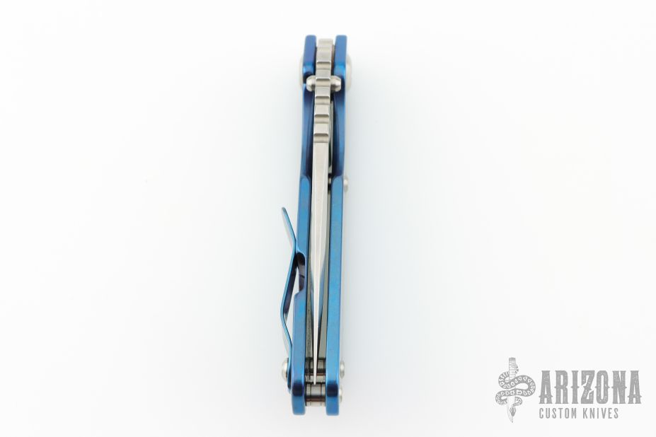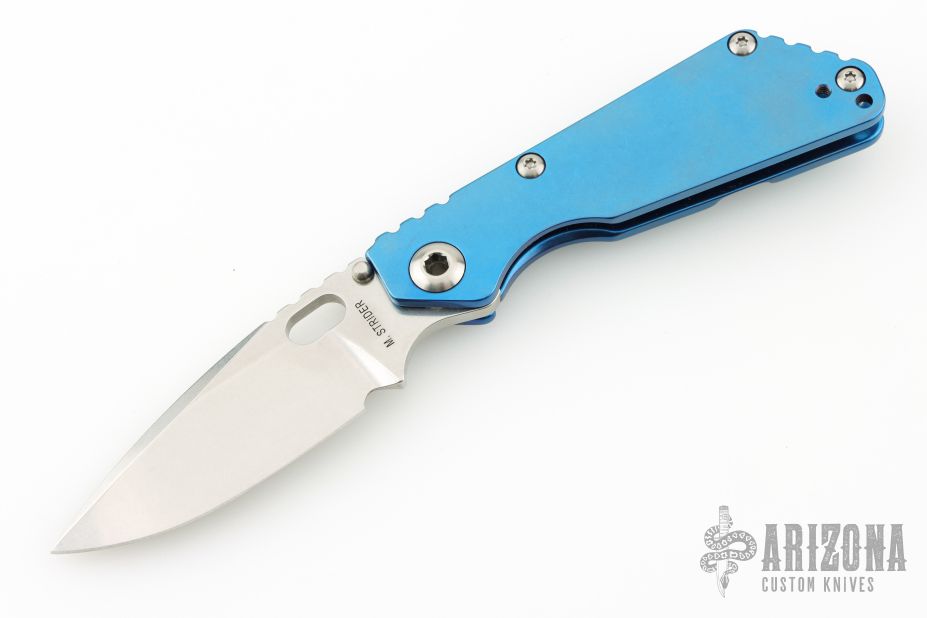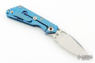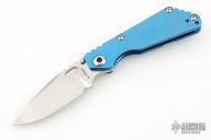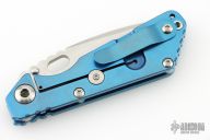 This Mick Strider Performance series SNG framelock folder features a stonewashed drop point blade with thumbhole and notched thumbrest. The handle has a Cobalt DLC titanium frame with titanium clip, tip up carry. Jimping on blade spine. Includes Hinderer "Lock Bar Stabilizer" for maximum reverse lock retention. Nice lockup, detent, and blade seating. New condition. Comes with a zippered case.