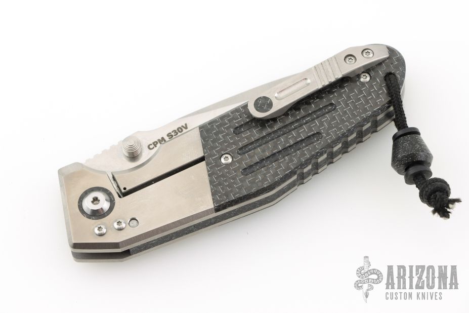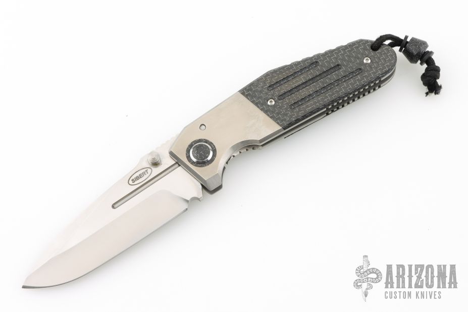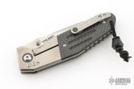 This Deluxe Pocket Rocket by Shane Sibert was the Open Bid knife for the 2014 USN Gathering. It features a satin finished blade with notched thumbrest, fullers and dual thumbstuds. The handle has satin finished titanium bolsters with integral liners, titanium hardware, silver lightning strike carbon fiber pivot collars and pivot inlay, silver lightning strike carbon fiber scales, tip up titanium clip with silver lightning strike carbon inlay. Rides on bearings, nice detent, lockup and blade seating. Comes with a Velcro case. Has a couple very light scratches, otherwise excellent condition. Has a custom matching carbon fiber bead.