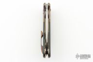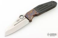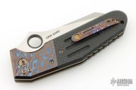 This Deluxe Pocket Rocket by Shane Sibert was the Open Bid knife for the 2014 USN Gathering. It features a satin finished blade with notched thumbrest, fullers, and carbon fiber inlaid thumbhole. The handle MokuTi bolsters, anodized titanium liners, titanium hardware, carbon fiber scales, tip up MokuTi clip. Rides on bearings, nice detent, lockup and blade seating. Comes with a Velcro case and COA dated 8/2015. Has a couple light scratches, otherwise excellent condition.