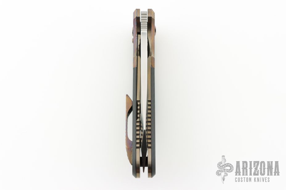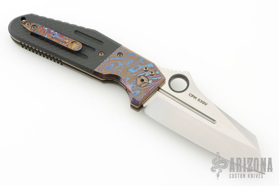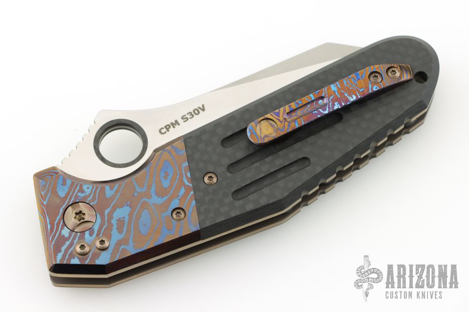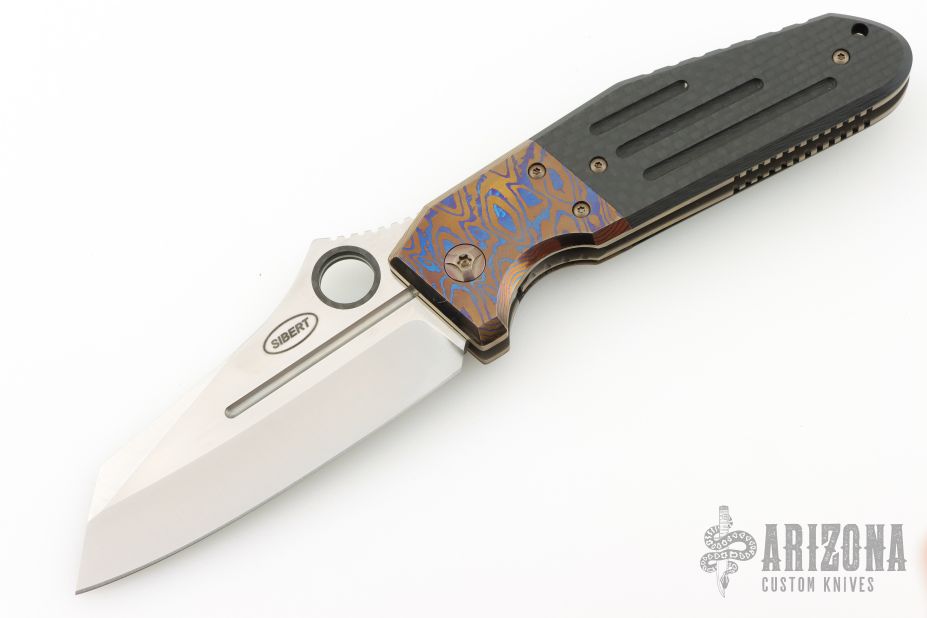 This Deluxe Pocket Rocket by Shane Sibert was the Open Bid knife for the 2014 USN Gathering. It features a satin finished blade with notched thumbrest, fullers, and carbon fiber inlaid thumbhole. The handle MokuTi bolsters, anodized titanium liners, titanium hardware, carbon fiber scales, tip up MokuTi clip. Rides on bearings, nice detent, lockup and blade seating. Comes with a Velcro case and COA dated 8/2015. Has a couple light scratches, otherwise excellent condition.