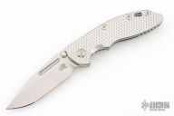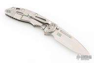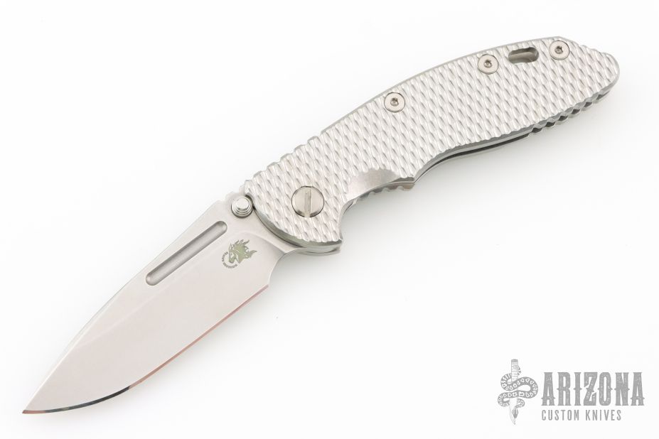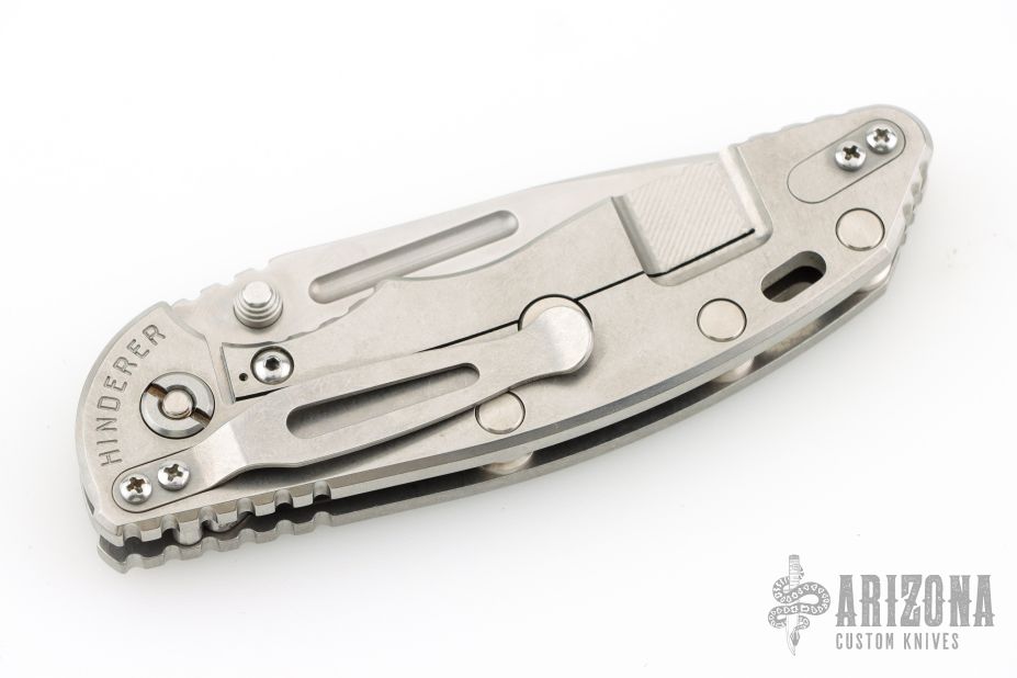This XM-18 Fullered Spear non-flipper from Rick Hinderer Knives features a 3.5" stonewash finished blade, notched thumbrest, fullers, dual thumbstuds. The handle has a textured titanium front scale and stonewashed titanium handle/clip. Clip can be mounted for tip up or down carry. Nice lockup, seating, and detent. Excellent condition. Comes with original box and original red G-10 scale and titanium liner.