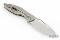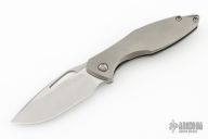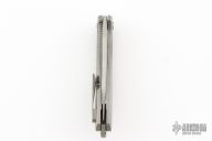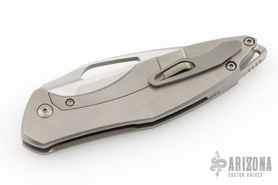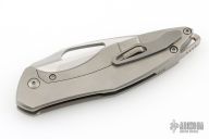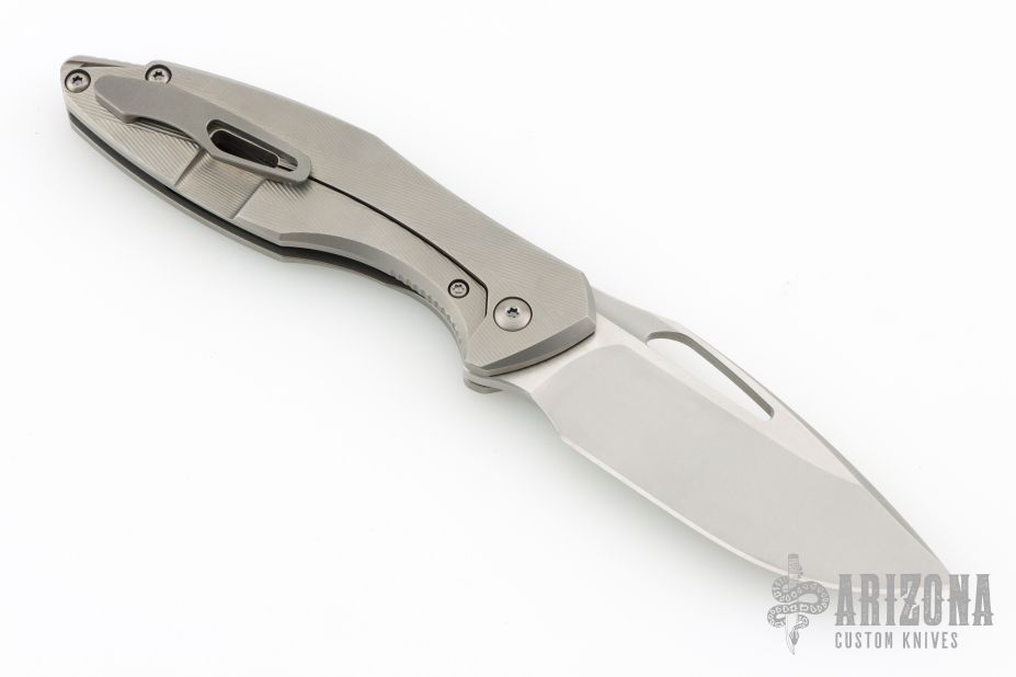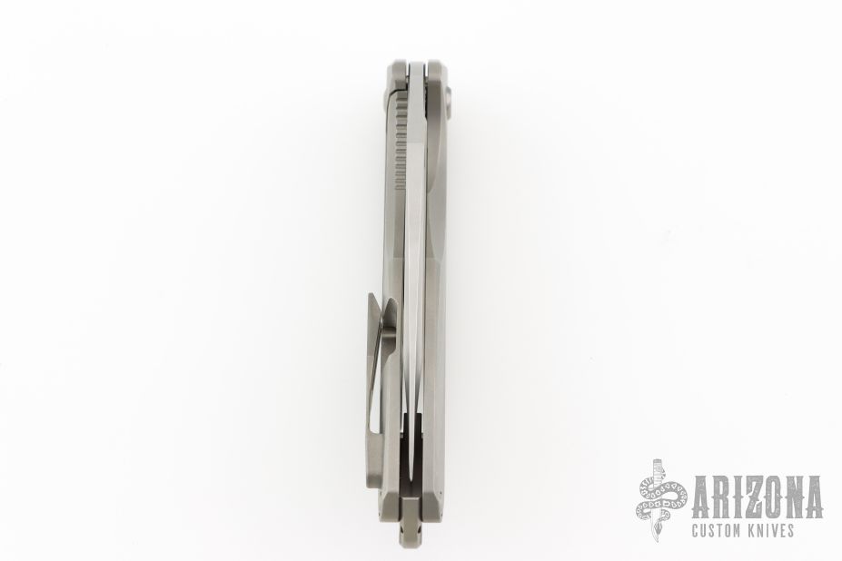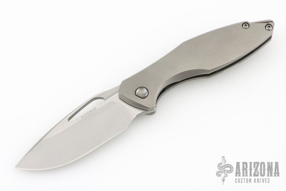 This Arius Non-Flipper by Koenig knives features a burnished blade with Polished Flats, and thumbhole. The handle has a bead blasted pattern milled titanium frame titanium backspacer and a bead blasted tip up clip with hidden screws. Has ceramic bearings and a ceramic detent ball. Nice detent, lockup and blade seating. Comes with original box and COA dated July 12, 2022. Excellent Condition.  Gen4B9.