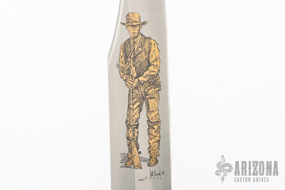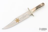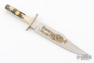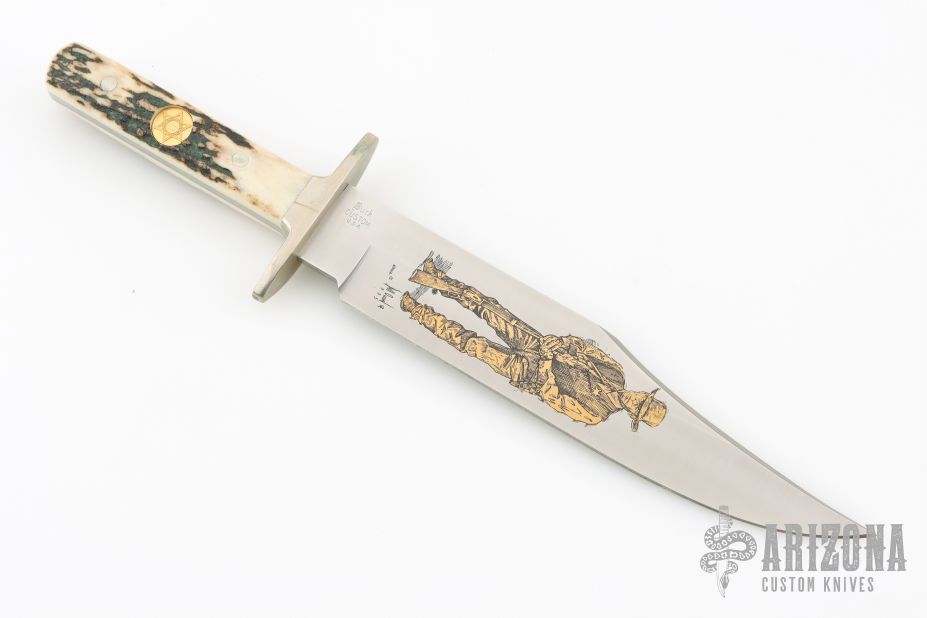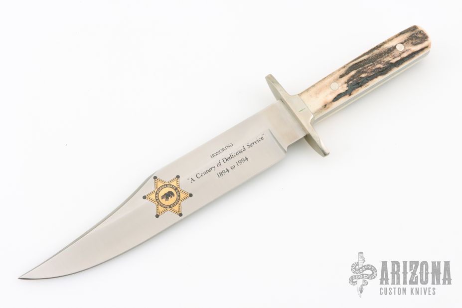 This Commemorative Bowie by Buck Knives features a satin finished clip point blade with false top edge, .181" blade stock and 1.447" blade depth, full tang construction. The handle has a nickel silver guard with stag scales. Has a couple light scratches, otherwise excellent condition.
