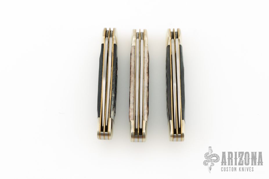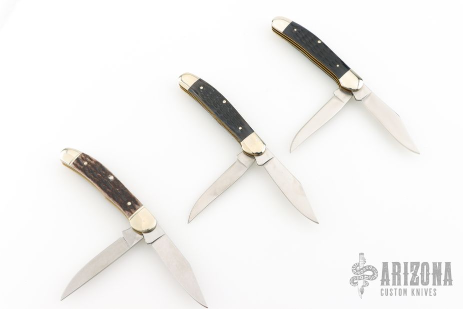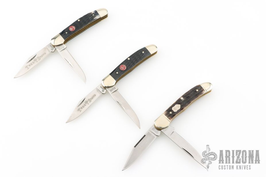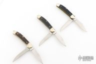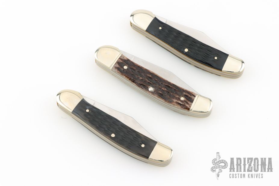 This set includes three, 2-Blade Trappers by Boker. Mirror polished blades, nickel silver bolsters, jigged bone covers, brass liners, stainless steel spring. Has some scuffs and scratches, great condition otherwise.