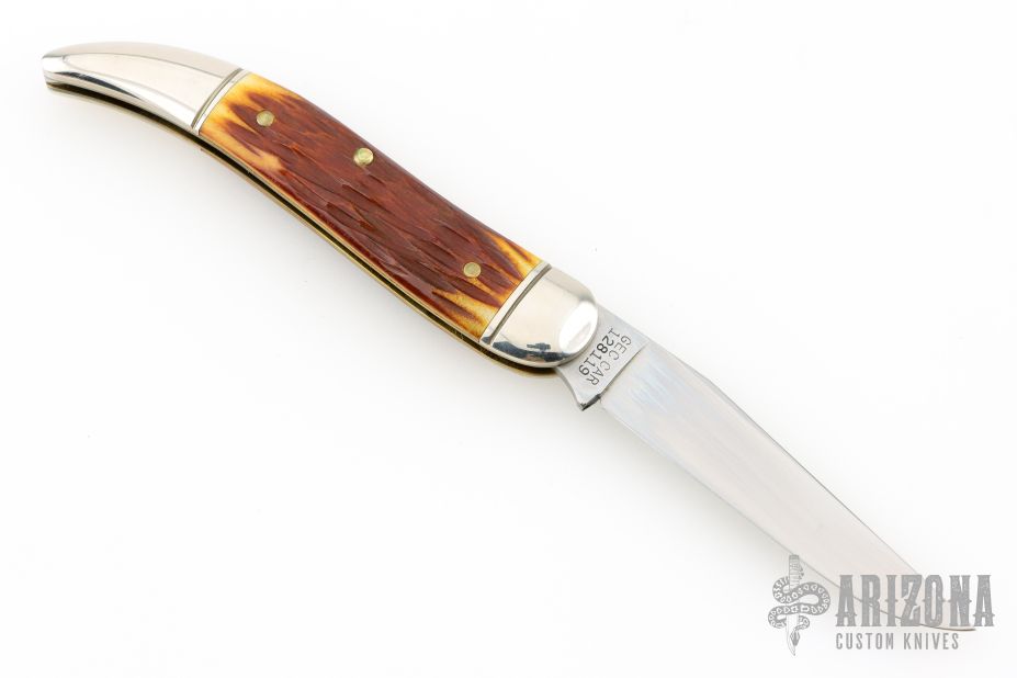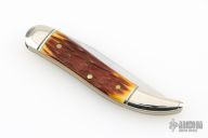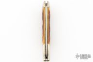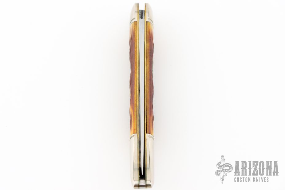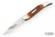 This Toothpick by Northfield Knives features a mirror finished blade with nail nick. The handle has nickel silver bolsters, jigged bone covers, brass liners, and a stainless spring. Has a couple light scuffs and scratches, otherwise great condition.