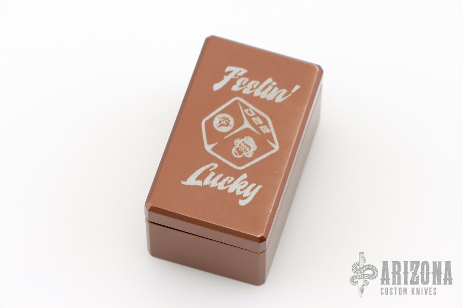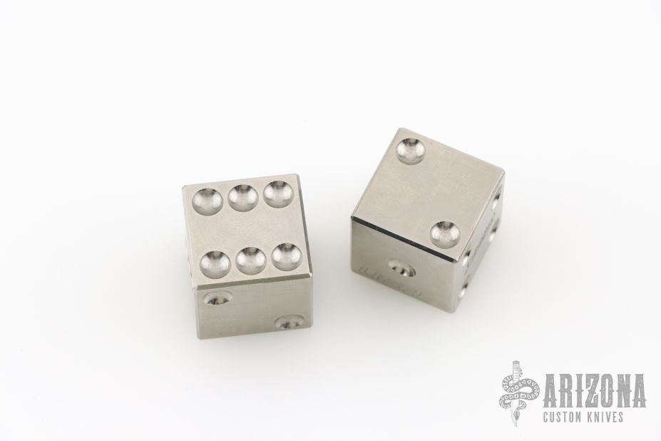 This pair of titanium dice are machine finished. "D22" and "USA". Comes with an anodized titanium box marked "Feelin' Lucky" and has the Monkey Edge logo on the front. Excellent condition.