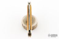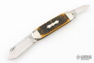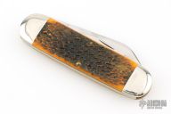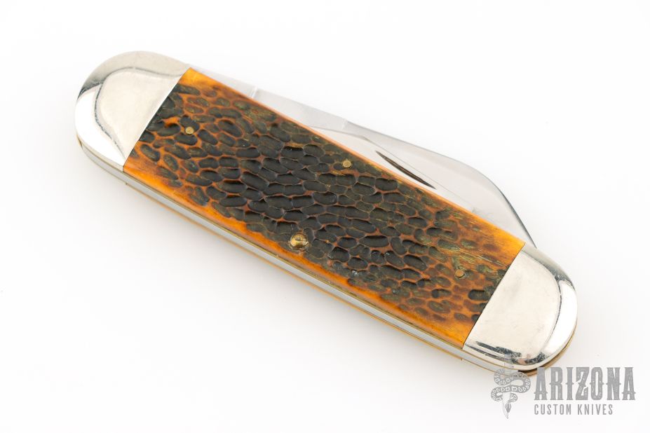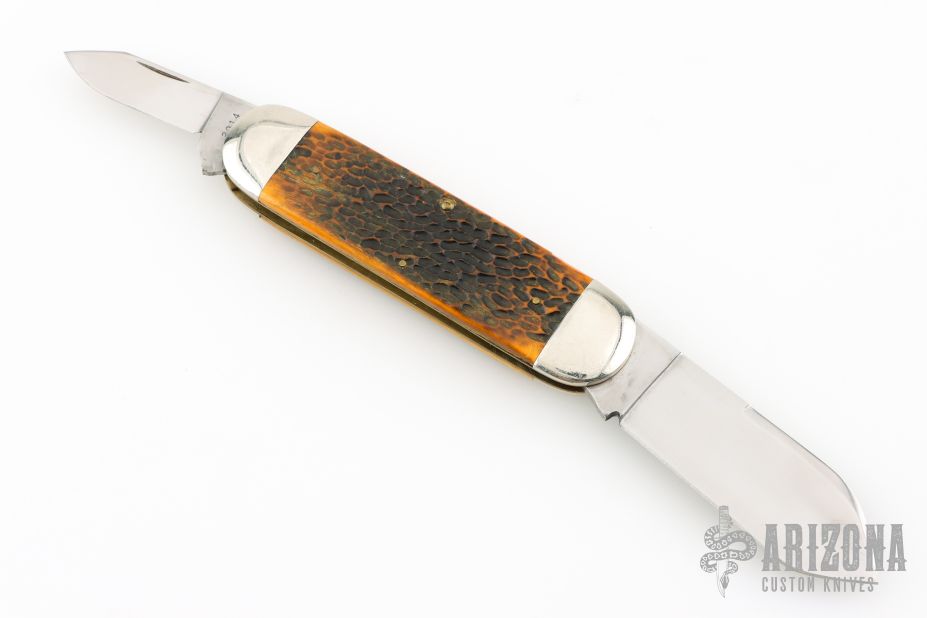 This Large Sunfish by Queen features satin polish finished blades with nail nicks.  The handle features nickel silver bolsters, brass liners and jigged bone covers. Stainless steel springs. Has some scuffs and scratches, great condition otherwise.