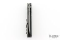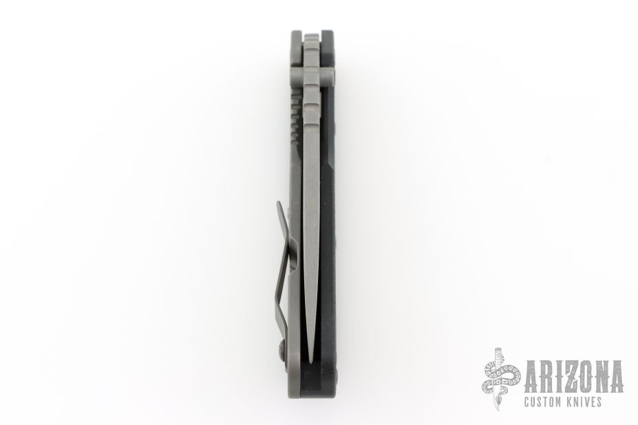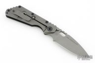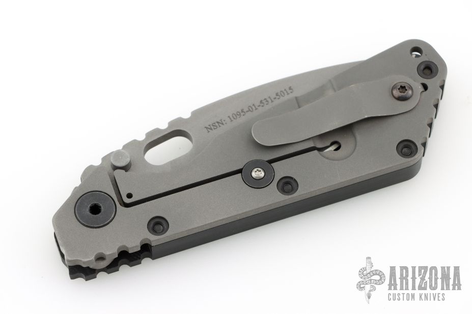 This SMF from Strider Knives features a bead blasted blade and black G10 and bead blasted titanium handle and anodized tip up titanium clip. Notches on thumbrest, rear of handle, and lockup. Includes Hinderer "Lock Bar Stabilizer" for maximum reverse lock retention. Has "NSN: 1095-01-531-5015" on blade. Nice action, detent and blade seating. Appears to be resharpened. Has scuffs and scratches, good condition otherwise.
