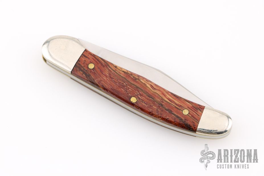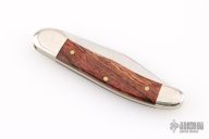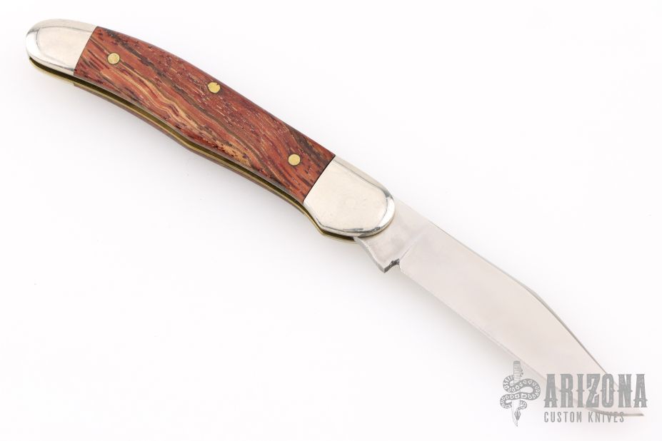 This slipjoint by Queen features a satin finished tool steel blade with nail nick. The handle features nickel silver bolsters, brass liners and wood covers. Steel spring. Has light scratches, otherwise excellent condition.