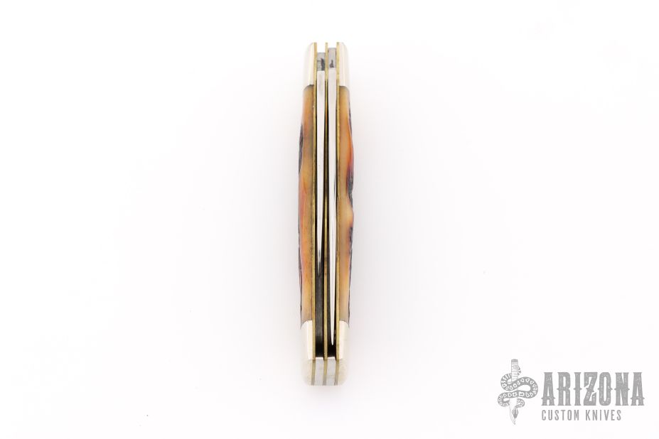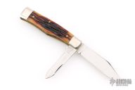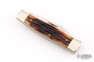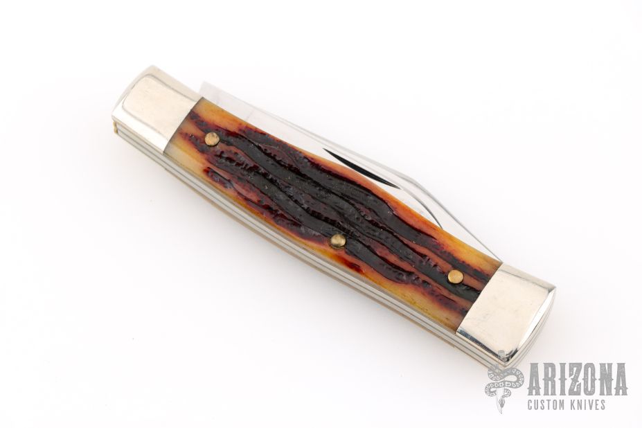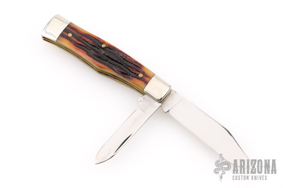 This slipjoint by Queen features a two mirror finished tool steel blade with nail nick. The handle features nickel silver bolsters, brass liners and groove bone covers. Steel spring. Has light scratches, otherwise great condition.