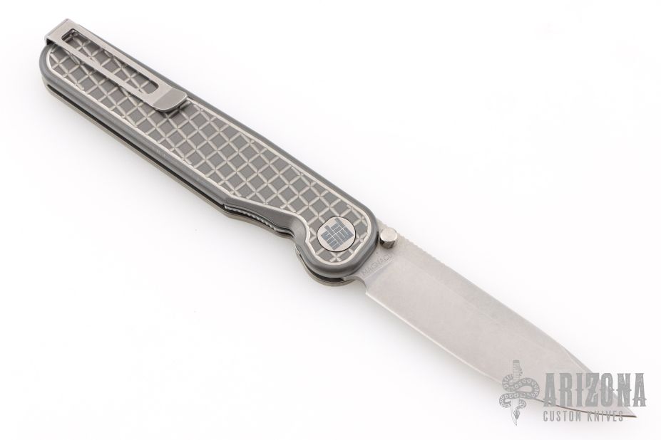 The Rockwall by Tactile Knife features a stonewashed Magnacut blade with notched thumbrest and dual thumbstuds. The handle has a MEFP milled titanium frame with a tip up stainless steel clip and backspacer. Comes with original box and COA. Excellent condition. Comes with a black leather wallet sheath that holds the knife and a pen and cards. Excellent condition.