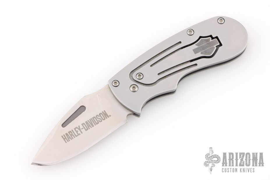 BENCHMADE 13310 HARLEY-DAVIDSON LEVITATOR MONEY CLIP - AUS8 High Carbon Stainless Steel blade; 420J stainless steel liners; 420J stainless steel backspacer and outer handle scales; patented Levitator® locking mechanism; and moneyclip / stainless steel carry clip. Measures 4.75" open and 2.80" closed.