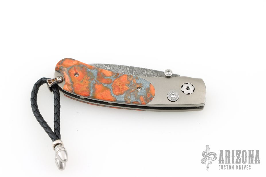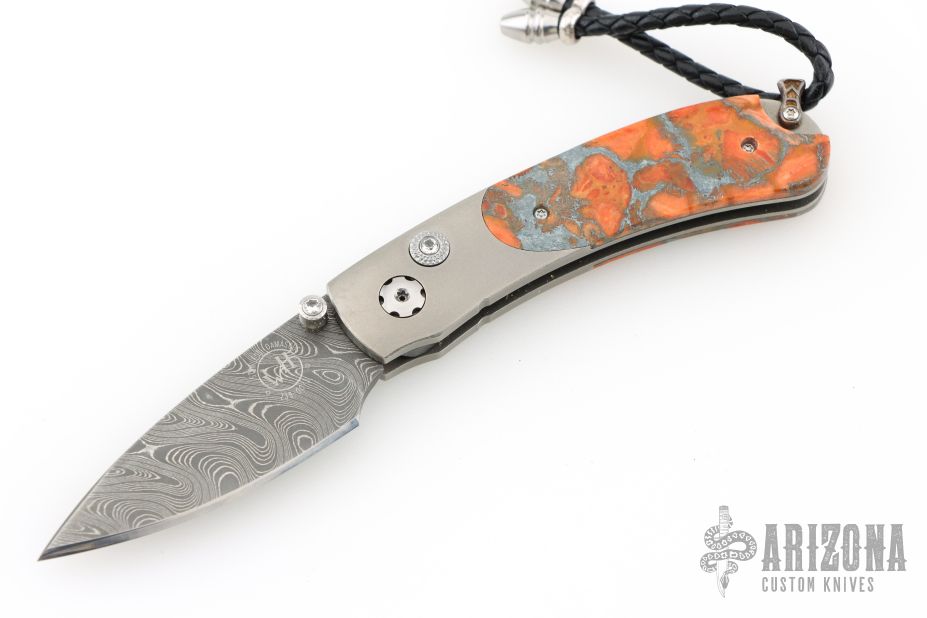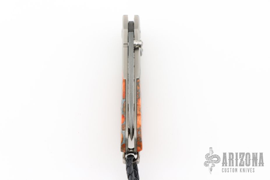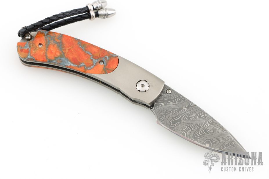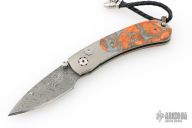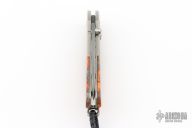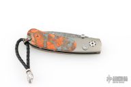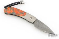 This Kestrel 'Glow' features a light and resilient frame in aerospace grade titanium, inlaid with zinc matrix apple coral.  The blade is hand-forged 'Boomerang' Damascus by Chad Nichols; the one-hand button lock and the thumb stud are set with white topaz gemstones.  Includes the original box and papers.  Excellent Condition.
