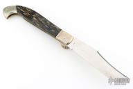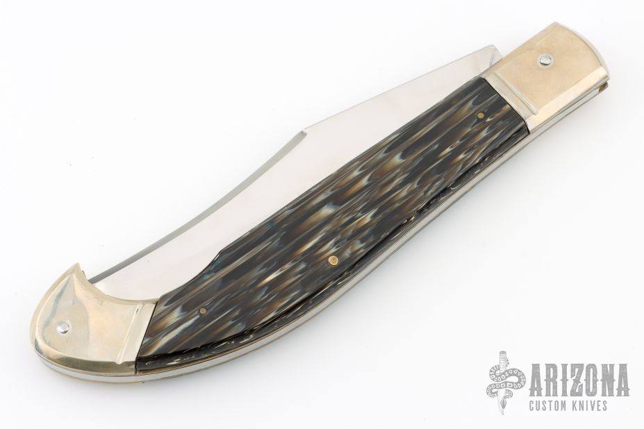 This Giant 21" Display knife by G.C. Co features a mirror blade with false top edge. The handle has nickel silver bolsters, celluloid covers with brass pins and liners, steel spring. Has some scratches, otherwise excellent condition for its age. Made in Italy