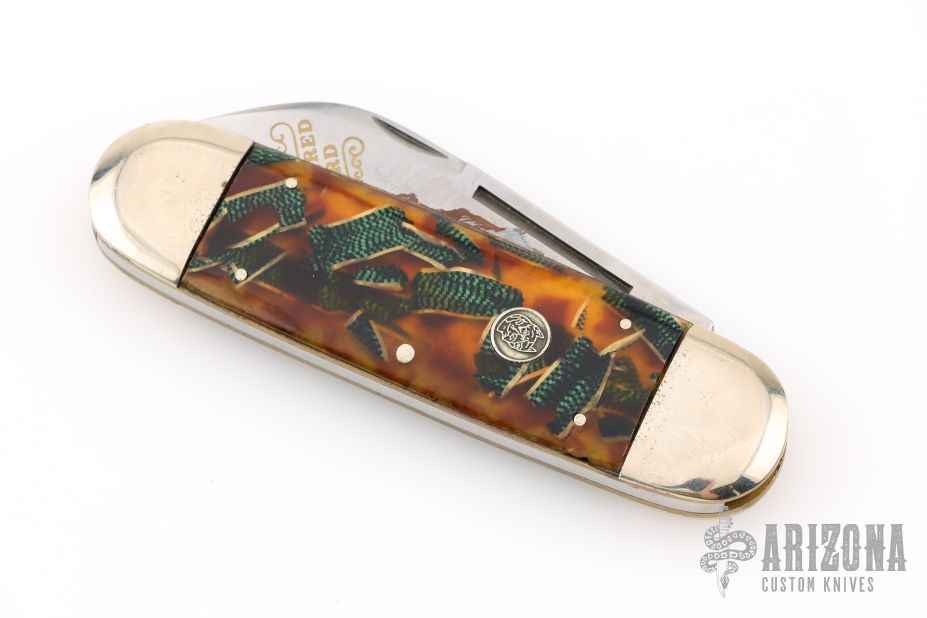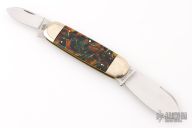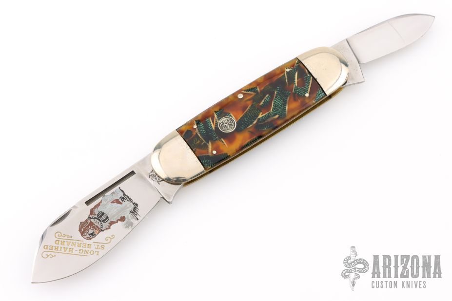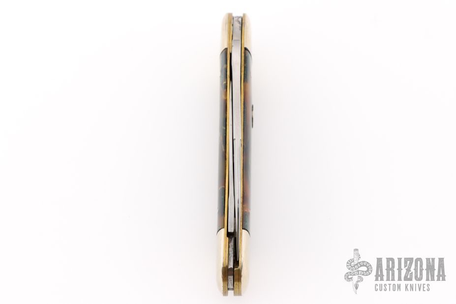 This Slipjoint from Bull Dog Brand Knives features polished blades with nail nicks. The handle has nickel silver bolsters, acrylic covers over brass liners and stainless steel spring. Has a few light scratches, otherwise excellent condition. Marked BD000 on the blade.