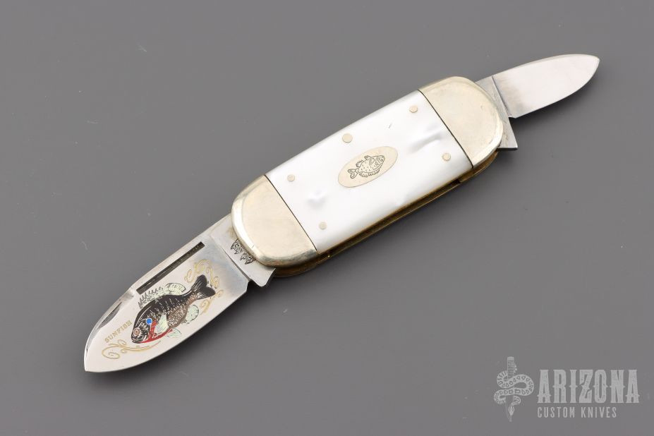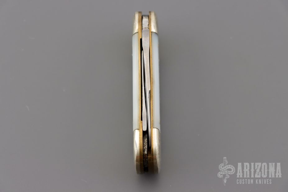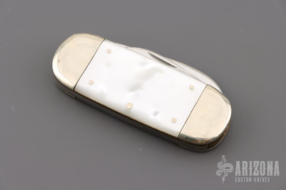 This Slipjoint from Bull Dog Brand Knives features polished blades with nail nicks. The handle has nickel silver bolsters, acrylic covers over brass liners and stainless steel spring. Has a few light scratches, otherwise great condition.