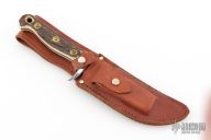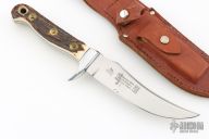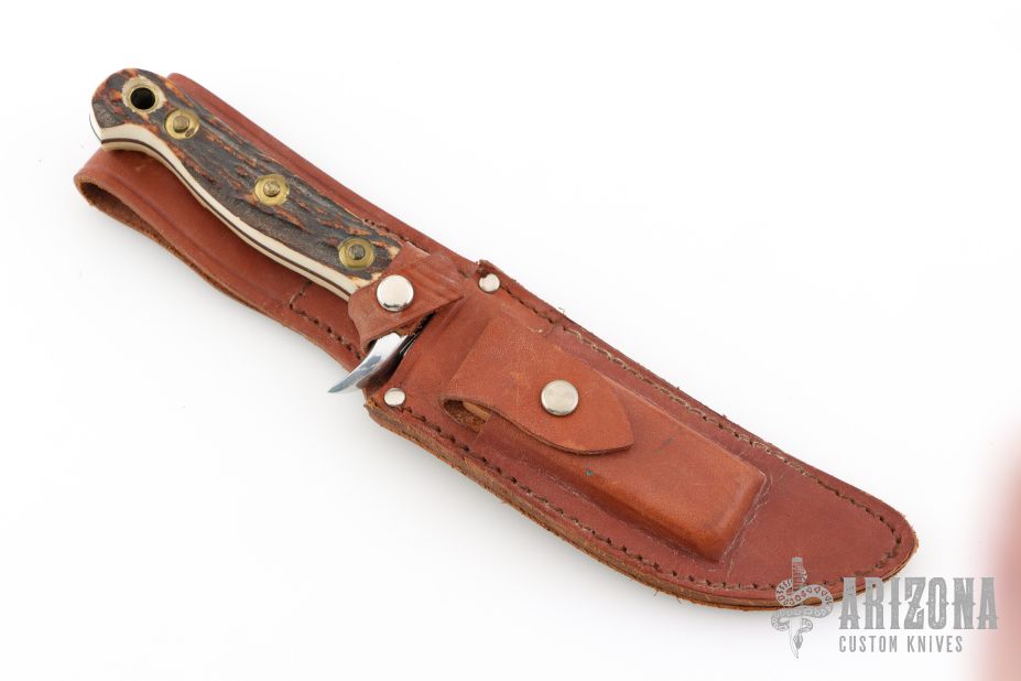 This Skinner by PIC was imported from Solingen Germany, it features a mirror finished clip point blade with false top edge and notched thumbrest, .151" blade stock and 1.167" blade depth, full tang construction. The handle has an aluminum guard and stag scales. Comes with original brown leather sheath. Has some scratches and some staining on the blade, otherwise good condition for its age.
