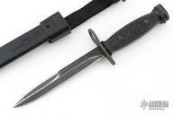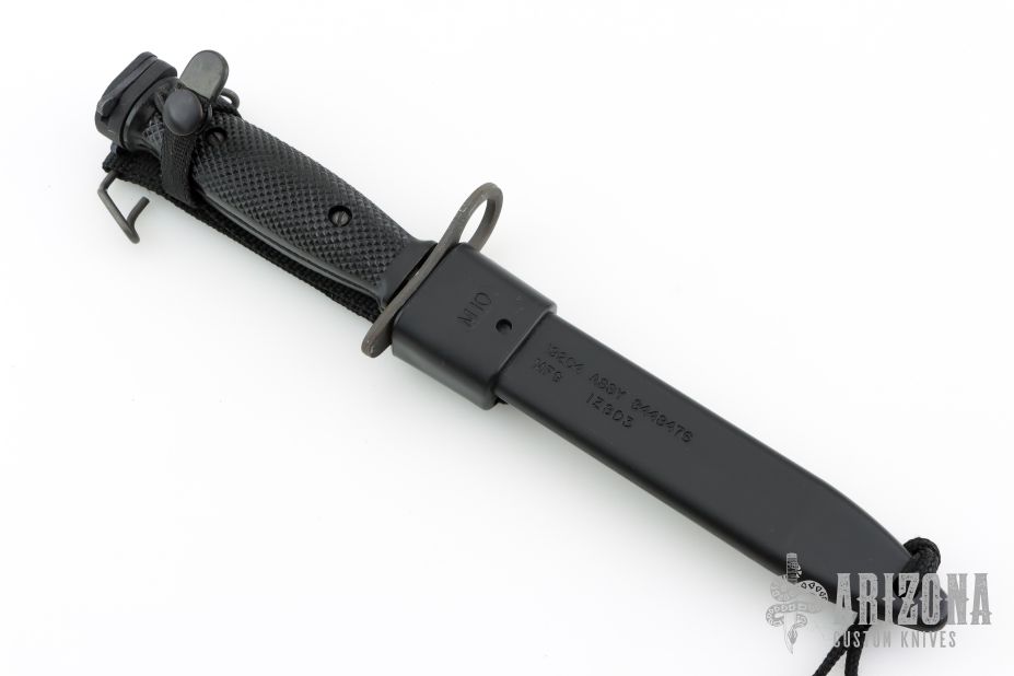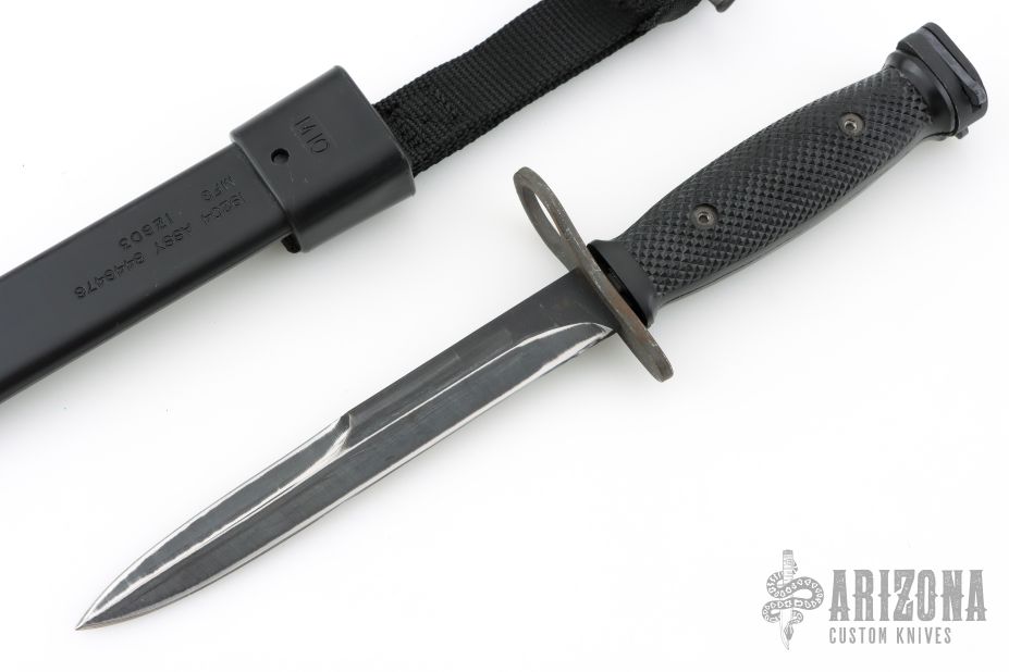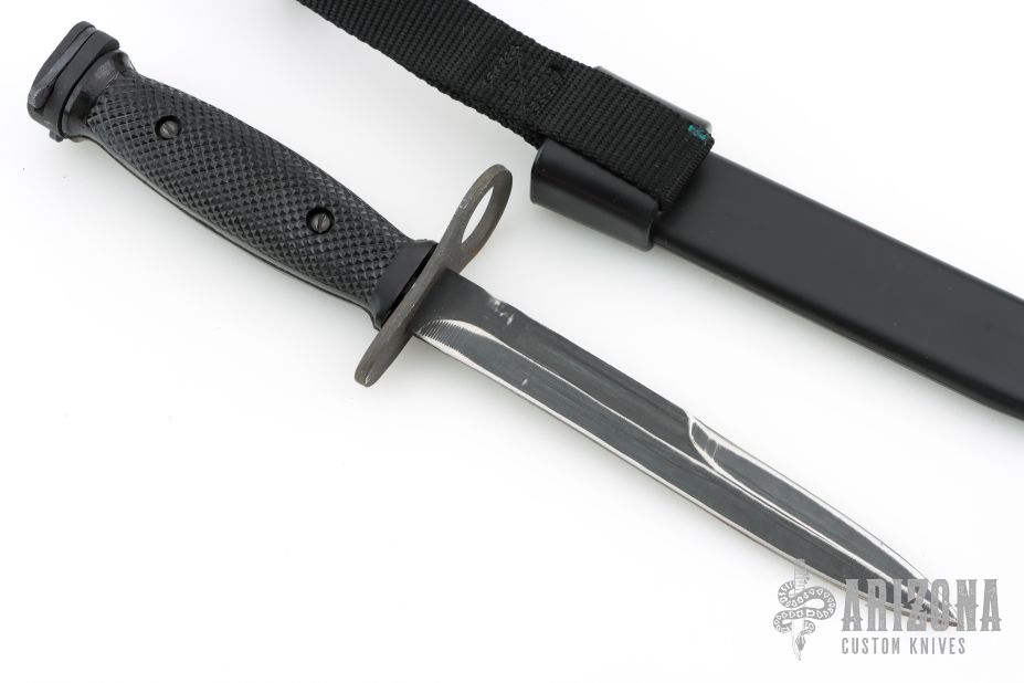 This is a Vietnam Era M7 bayonet for the M16 rifle by Conetta. Includes plastic sheath marked M10. Has some sheath marks, has been resharpened, otherwise good condition.
