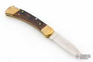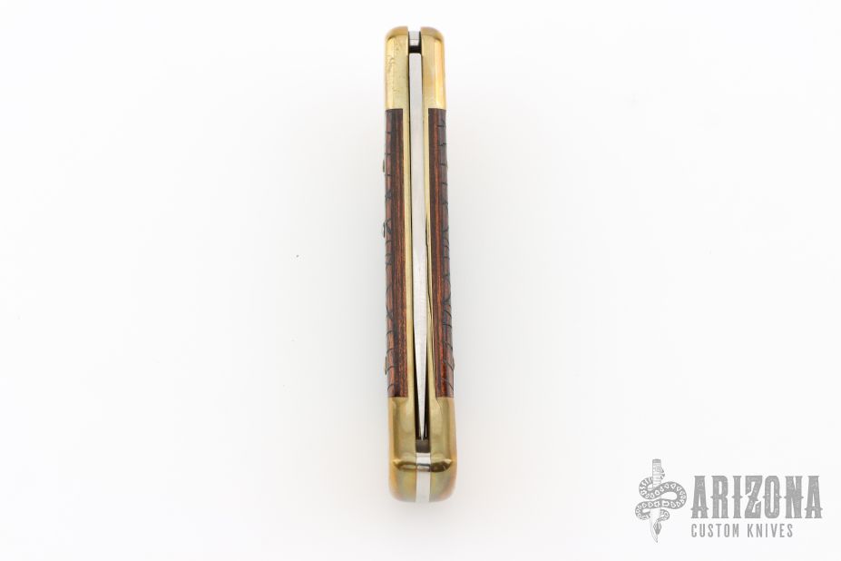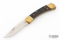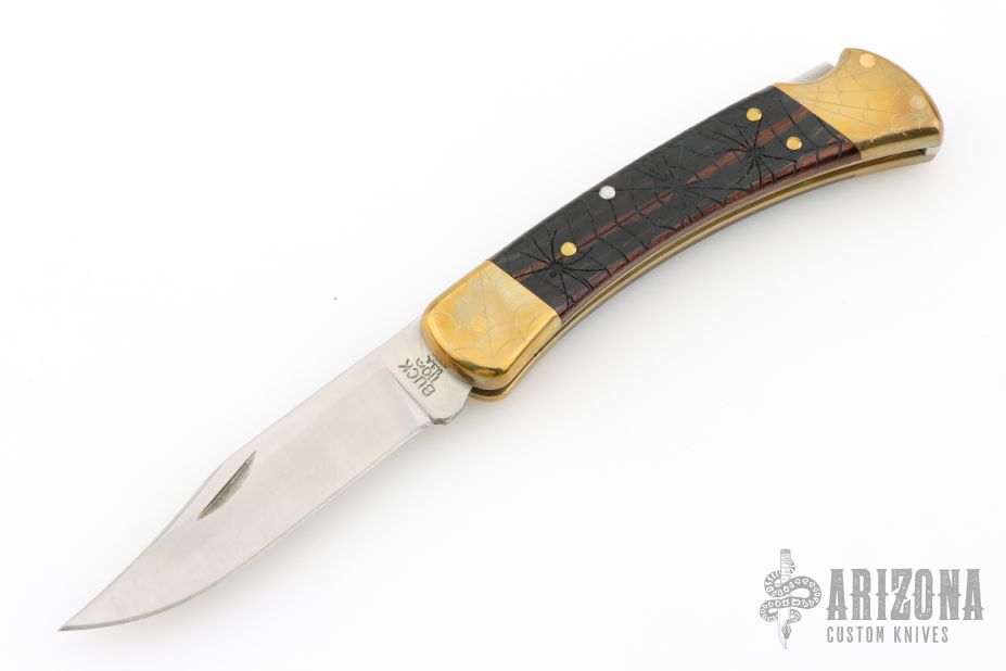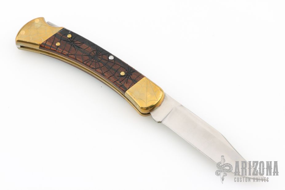 This Model 110 by Buck features a satin finished blade with nail nick. The handle has a brass frame with wood scales. The bolsters and wood inlay has cobwebs, spider webs, and spiders engraved. The blade is marked #023. Comes with a Buck leather belt sheath. Has a couple light scratches, excellent condition otherwise.