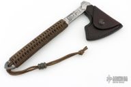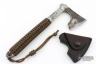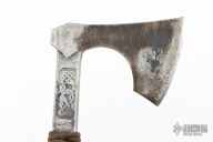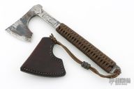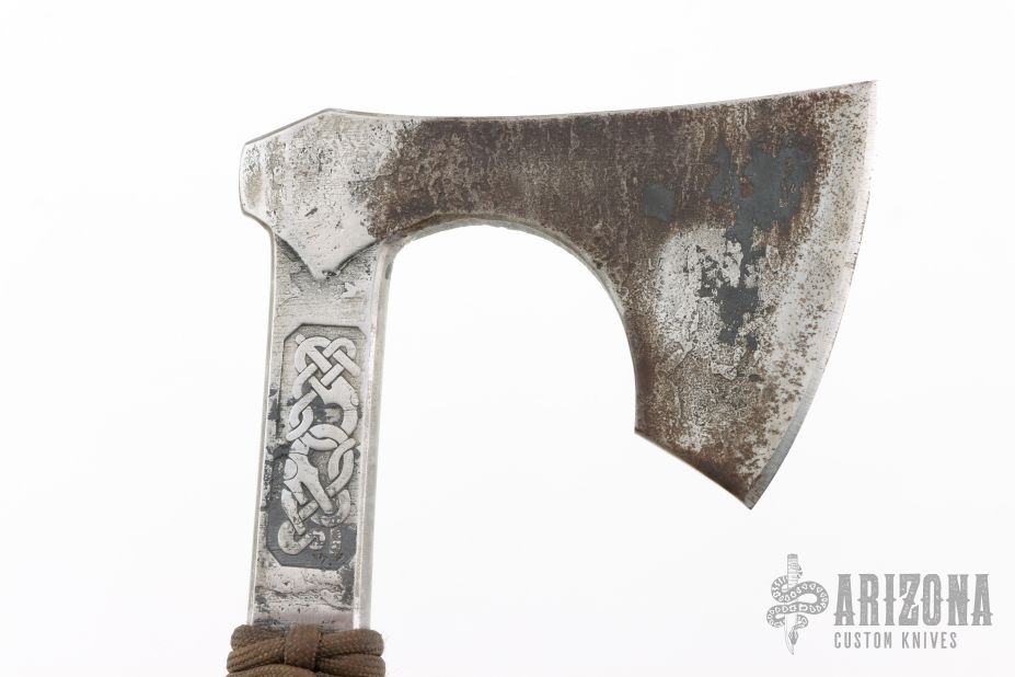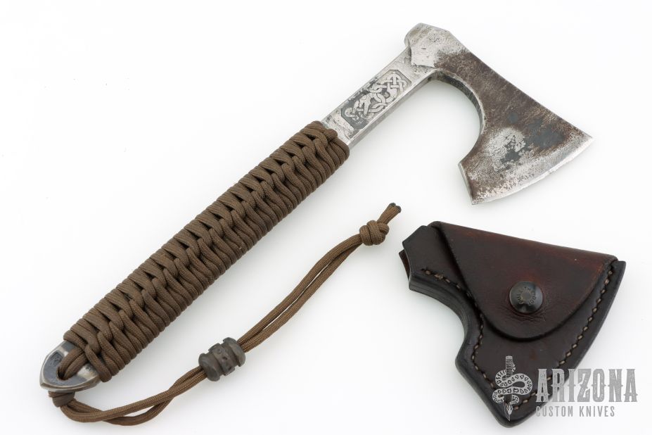 The Raven is a full custom nordic inspired bearded ax. Forged from super tough 4140 steel, it is a true working ax, not just a safe queen. The neck features a Viking knotwork design forged into the steel. The handle is wrapped in paracord. It comes with a custom leather scabbard. The Raven is designed, forged, and finished by crew member Reid Carmack. Has some oxidation on the blade, otherwise good condition.