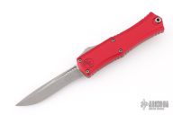 This knife features a tumbled recurve blade. The handle has a red aluminum chassis with a tumbled titanium pocket clip. Includes the original box and papers. 04/2025. Excellent Condition.