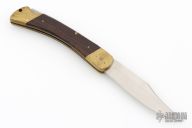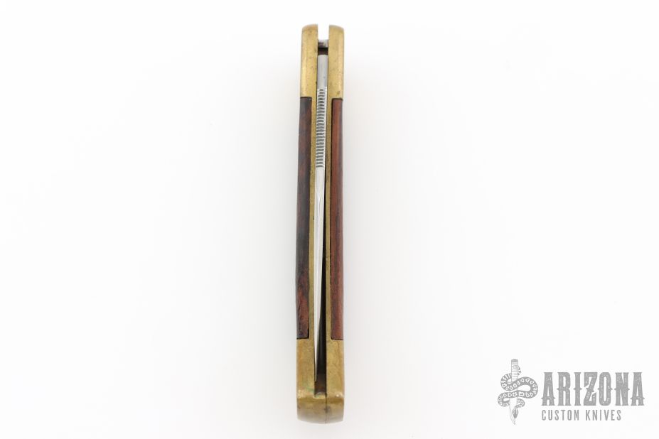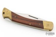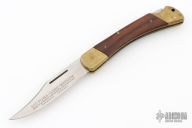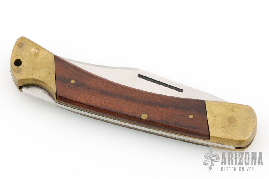 This Puma Game Warden lockback has a brass frame with wood scales. The blade is satin finished with nail nick. Has some light scratches and patina, otherwise good condition. #90174.