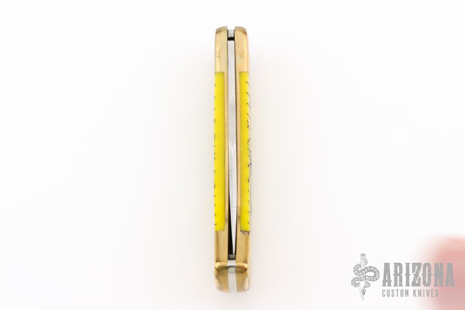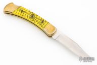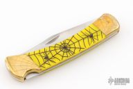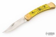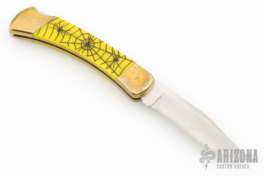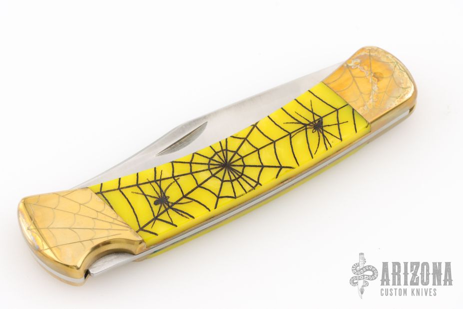 This Model 110 by Buck features a satin finished blade with nail nick. The handle has a brass frame with yellow scales. The bolsters and wood inlay has cobwebs, spider webs, and spiders engraved. The blade is marked #026. Comes with a Buck nylon belt sheath. Has a scratches, patina, excellent condition otherwise.