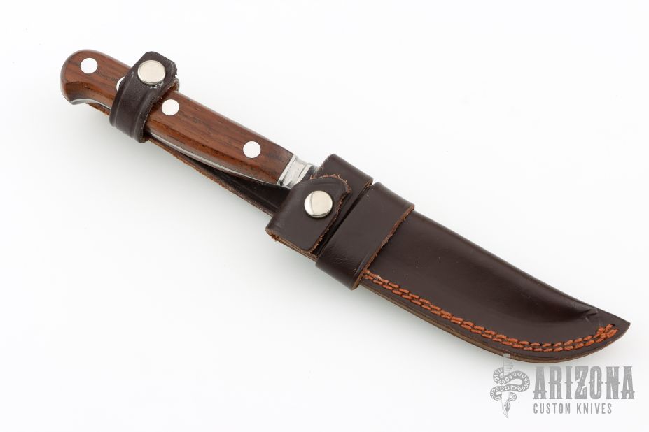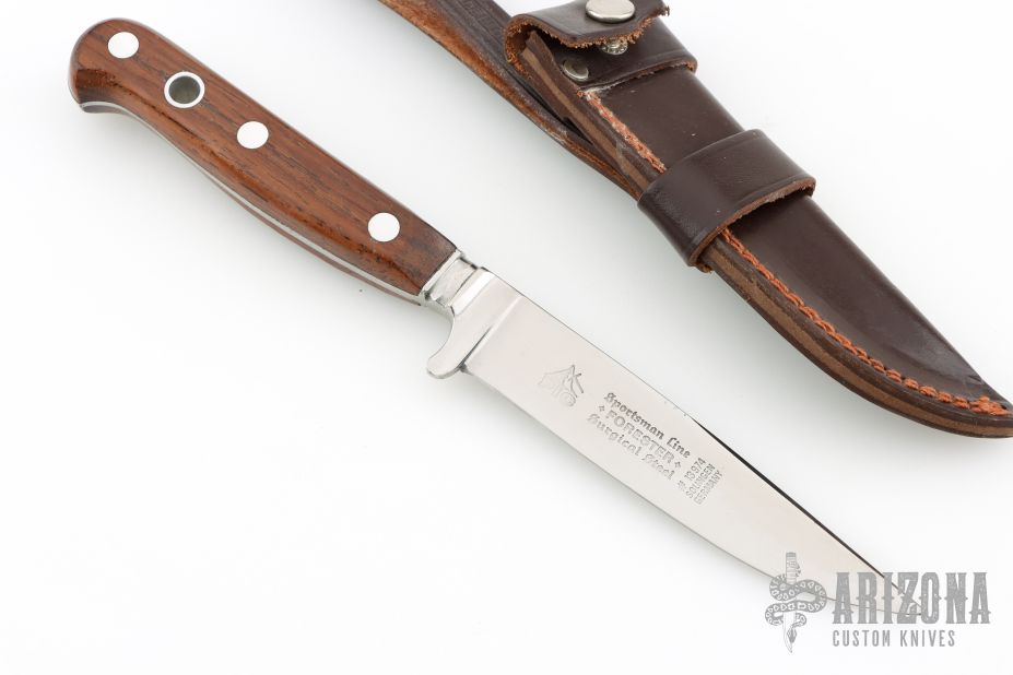 This Forester by PIC was imported from Solingen Germany, it features a mirror finished clip point blade with false top edge, .175" blade stock and .875" blade depth, full integral tapered tang construction. The handle has wood scales and aluminum pins and lanyard hole. Comes with original brown leather sheath. Has some light scratches, otherwise excellent condition.