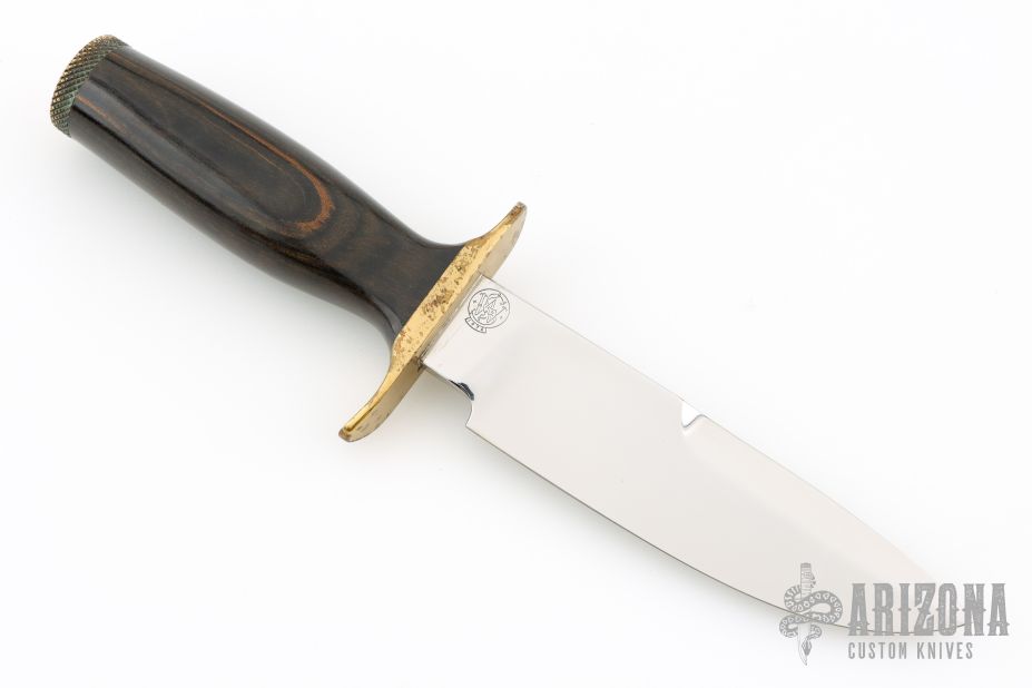 This knife by Smith and Wesson features a mirror polished spear point blade with sharpened top edge, .242" blade stock and 1.309" blade depth, hidden tang construction. The handle has a brass guard, hollow wood handle and a knurled brass butt cap. Excellent condition. Made in the 70's. #4459.