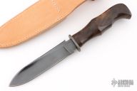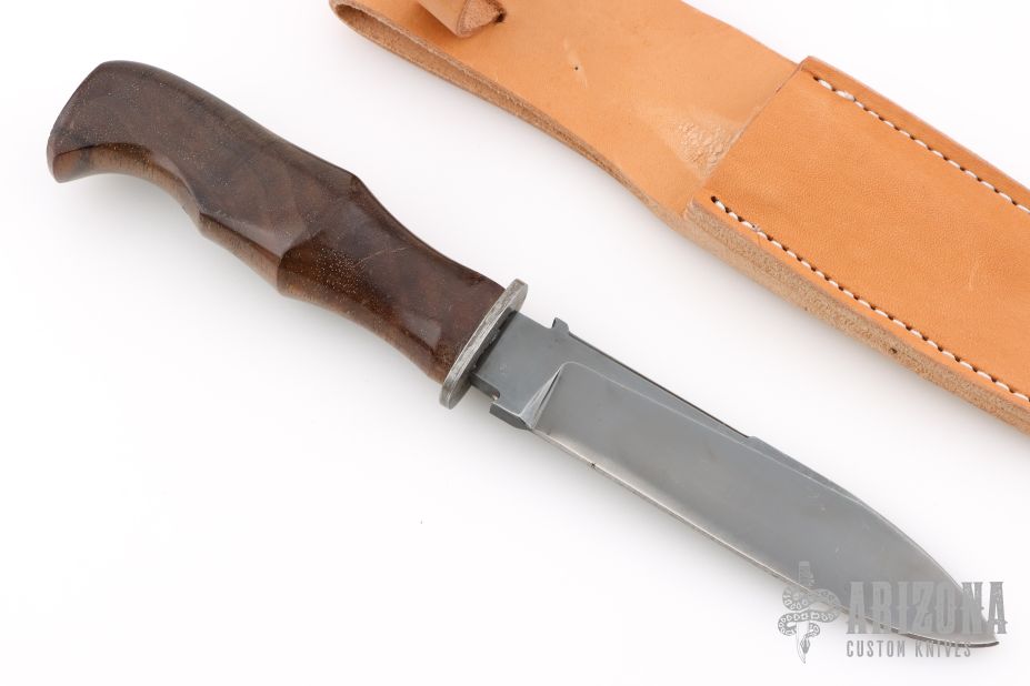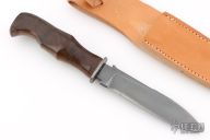This hunter by Markley Lahrmann features a blued blade with .245" blade stock and 1.131" blade depth, hidden tang construction. The handle has Damascus guard and a walnut grip. Comes with a leather sheath with belt loop. Has some scratches, otherwise good condition.