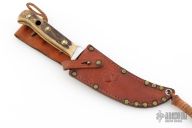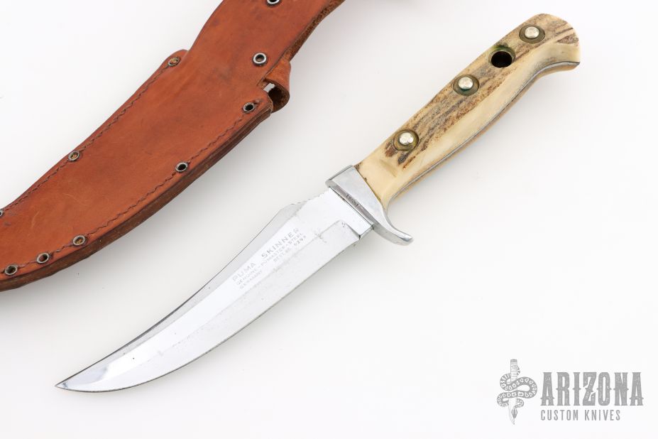 This skinner features a satin finished upswept blade with false top edge and notched thumbrest, full tang construction, .146" blade stock and 1.159" blade depth.  The handle has an aluminum guard and stag scales with brass rivets. Includes a brown leather sheath. Has some light scratches and patina, otherwise good condition for its age. #76582. Made in 1968
