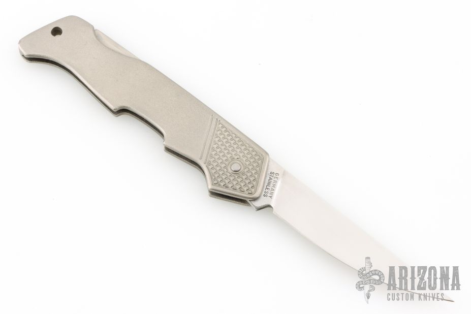 Titanium handles make this knife 47% lighter than the same knife with conventional steel handles. Handy finger grips give you a no-slip power hold. 3 1/8" stainless steel locking blade is hardened twice for extra strength, then hand-sharpened. The thin construction fits even snug pants; attaches to belt with lanyard hole. Closed length: 4 3/8". Weight: 2.5 oz. Made in Solingen, Germany.