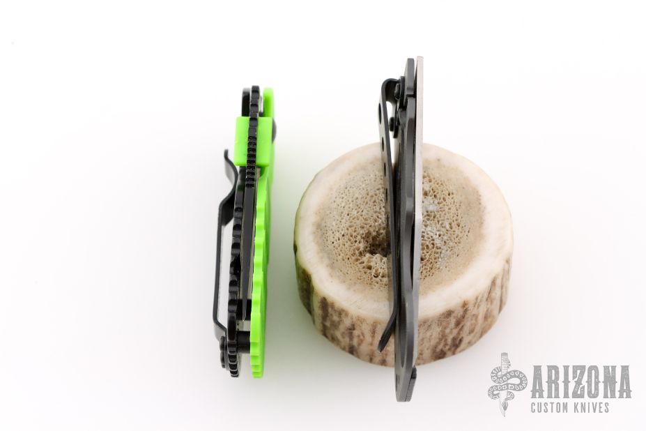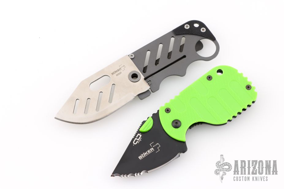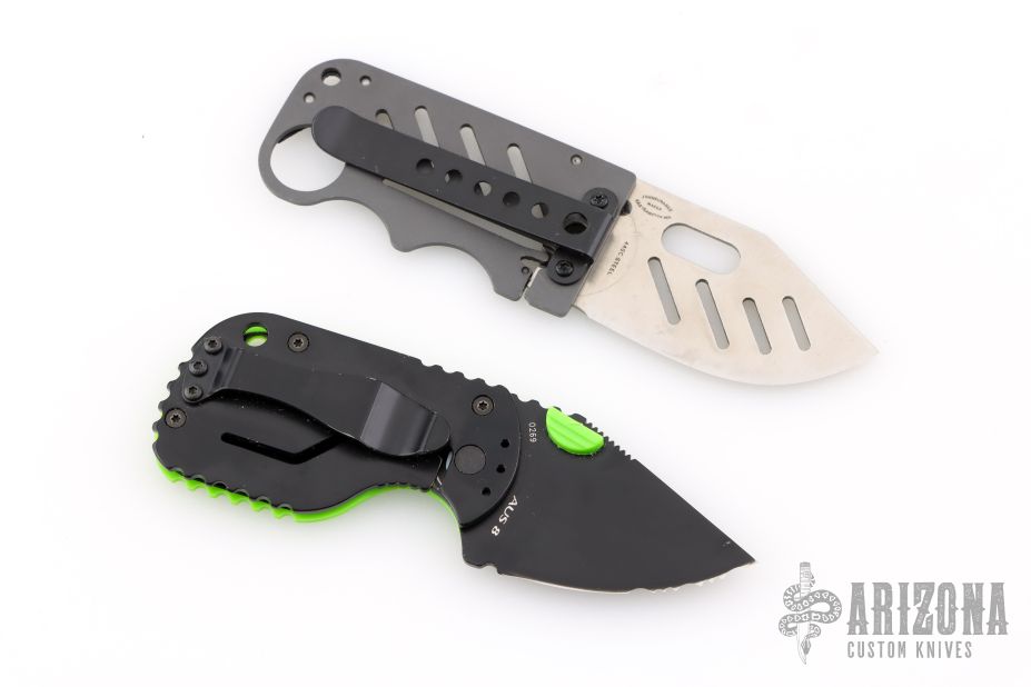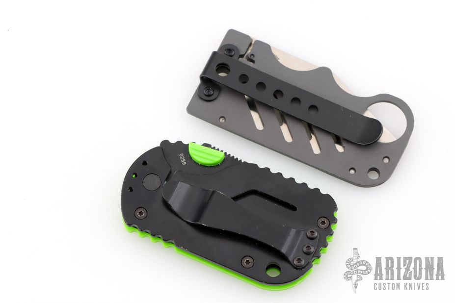 Though it is not touted as a zombie killer, the Boker Plus Subcom Plus Zombie Green handles features an AUS-8 stainless steel blade with ambidextrous toxic green thumb stud with reversible pocket clip which could double as a money clip. The compact size of the Boker Plus Subcom. The Zombie green handles are FRN reinforced nylon with palm index ramps for excellent grip. The blade locks up via slip joint.