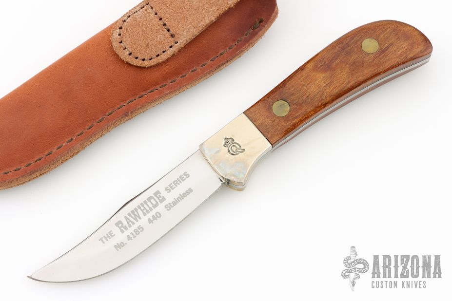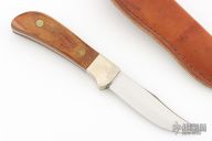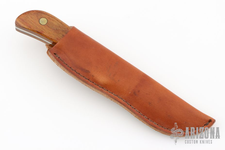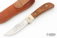 This fixed blade by Queen features a satin finished blade with clip point, .130" blade stock and .940" blade depth, full tang construction. The handle is comprised of nickel silver bolsters and wood scales with brass pins. Comes with leather belt sheath. Excellent condition. Comes with original box.